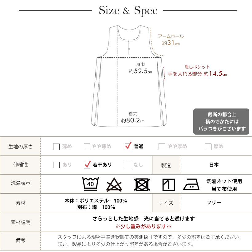 | 【特徴】 動くたびに見えるサイドの花柄がとってもおしゃれ♪ 体のラインをキレイに見せてくれる、こだわりデザインのAラインのカバーエプロン。左右に隠しポケット付きで、使い勝手も◎ 後ろ姿もスッキリとお尻も隠れて、おしゃれに体型カバーも♪ 乾きやすいさらっとした肌触り。デザインやサイズ感にこだわった、 丁寧な作りの日本製エプロン。工場直営のエプロン専門店ならではの高品質エプロンは、 ギフトやプレゼントにも最適です。 【製品仕様】 ■品質:【本体】ポリエステル 100%、【別布】綿 100% ■素材説明:さらっとした生地感。光に当てると透けます。 ■サイズ:フリー ■生地の厚さ:普通 ■製造:日本 |