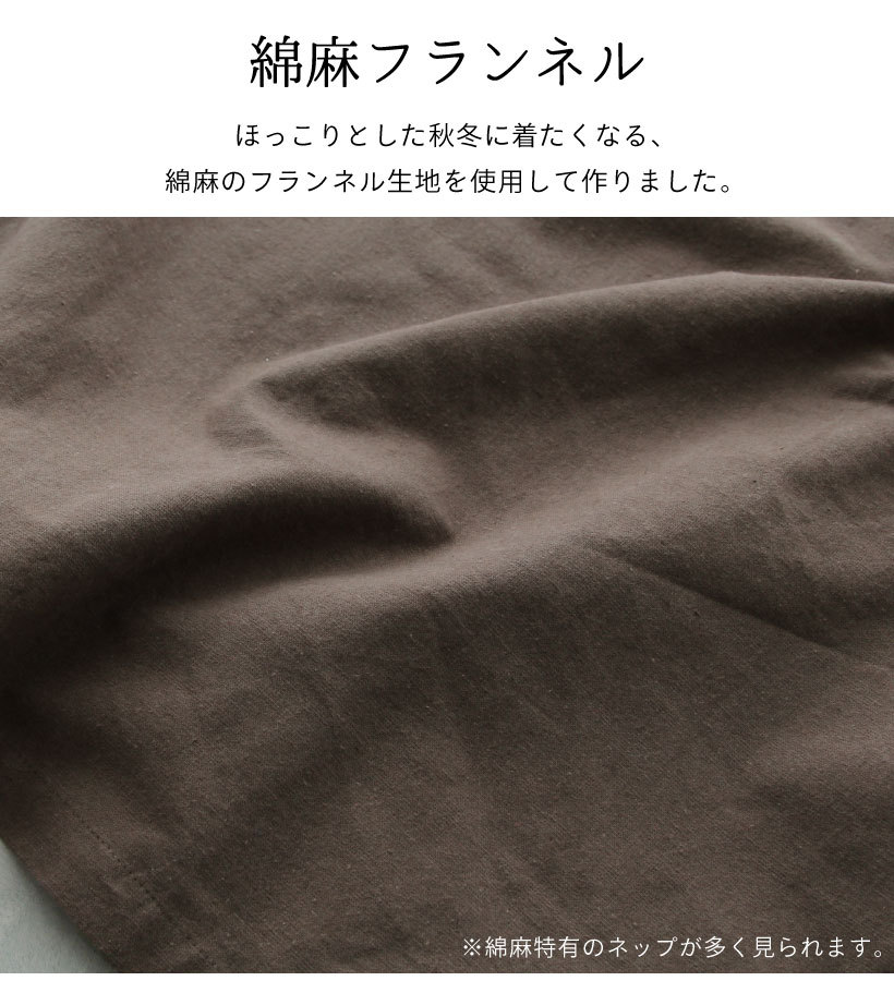 ●この製品は、麻を使用しています。素材の特性上、しわになりやすく縮む性質があります。生地表面のネップ感や織りムラがありますが、これはこの生地の特徴です。また、着用や洗濯の摩擦により、白化や毛羽立ちが発生します。