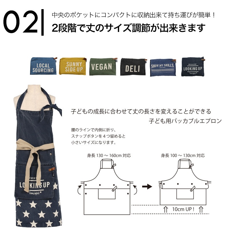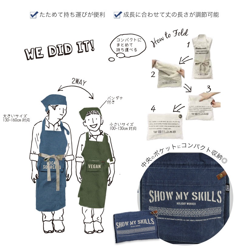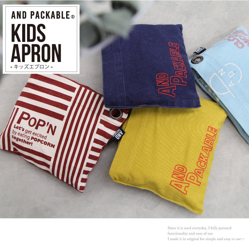 | しっかりとした綿100%の生地でできた、ポケットにしまってコンパクトに持ち運べる、おしゃれな子ども用のパッカブルエプロン。ボタンで簡易的に裾上げができて、対応サイズの幅が大きいので長く着用できるべんりな作りのエプロン。色落ち感やダメージ感がおしゃれなエプロン。ヴィンテージライクなデザインは、男の子、女の子でもおしゃれ。親子でお料理を楽しんだり、お手伝い、学校行事、習い事にもぴったり。同生地ののバンダナがセットになります。 | ||