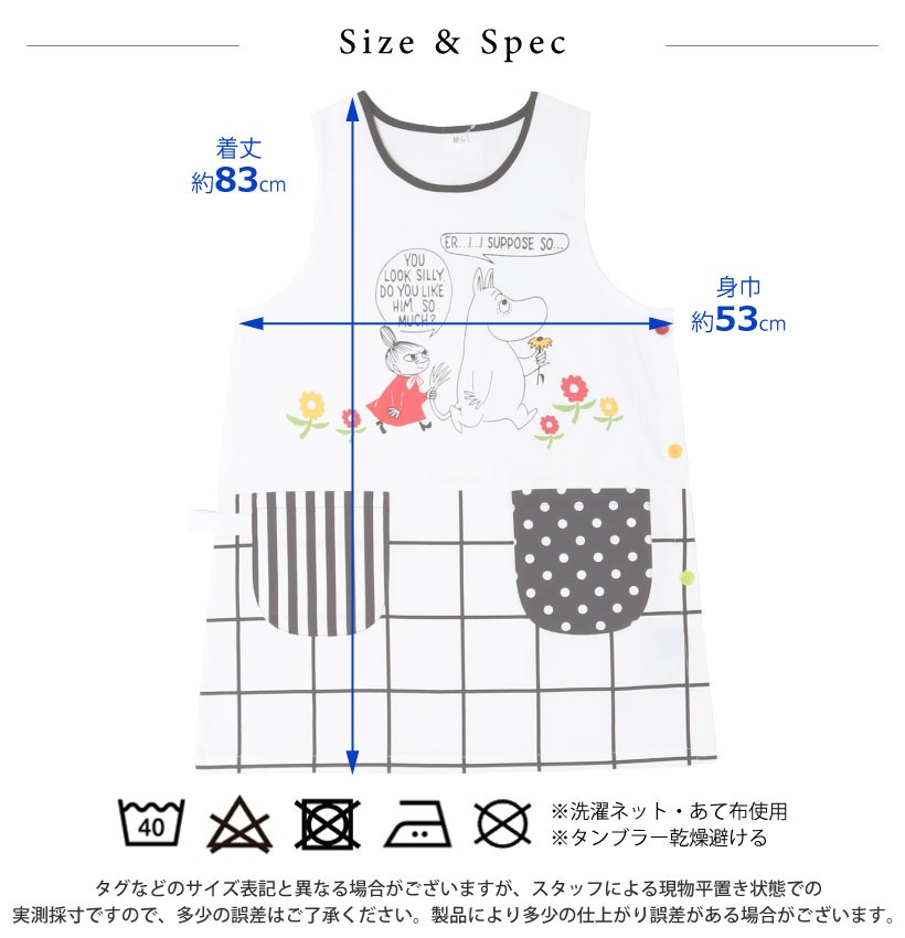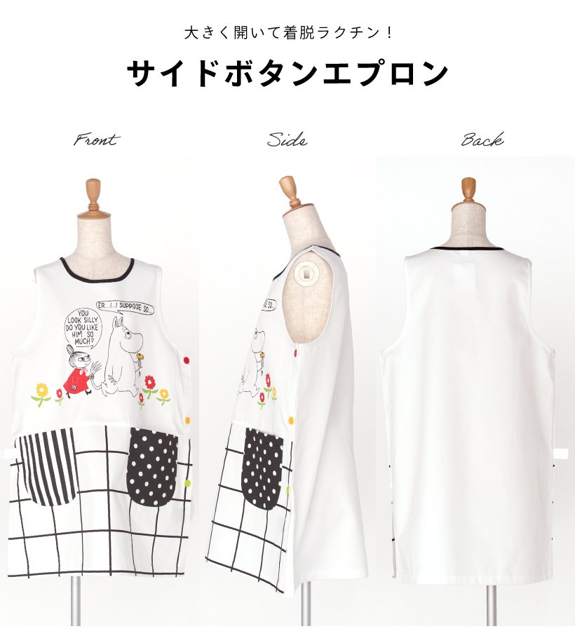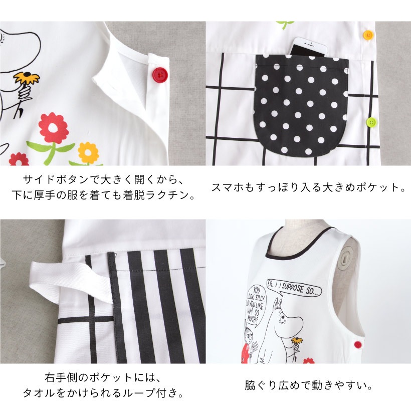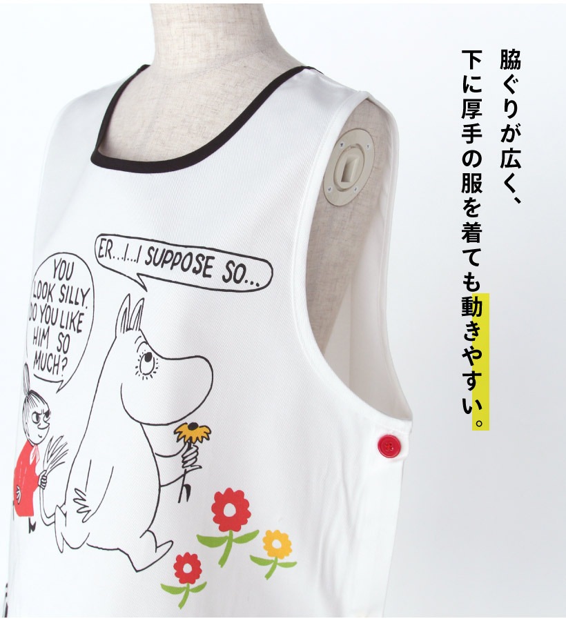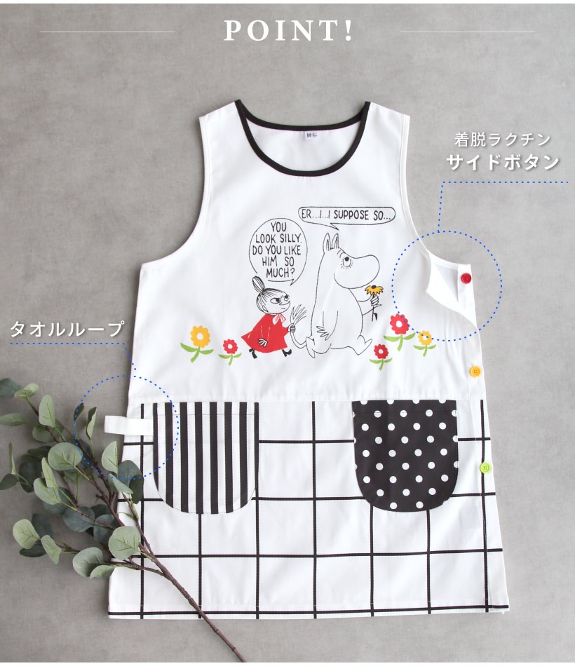 | カジュアルなムーミンたちの、着脱ラクチンカバーエプロン!2つのポケットにタオルループが付いて、使い心地も抜群。シワになりにくい生地を使用しているので、お仕事着としてもおすすめです。 | |