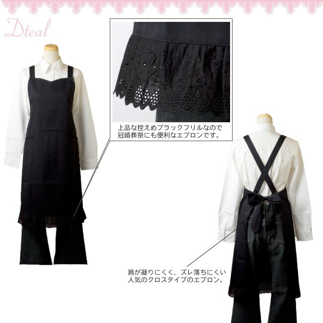 胸元のMデザインがおしゃれでかわいいエプロン。体型や年齢を選ばずに着られる、デザインで、裾の控えめフリルもかわい過ぎない上品なエプロン。肩が凝りにくく、ずれにくい人気のクロスタイプ。丁寧で上品な作りの日本製エプロン。慶弔・冠婚葬祭にも使えるフォーマルエプロンです。