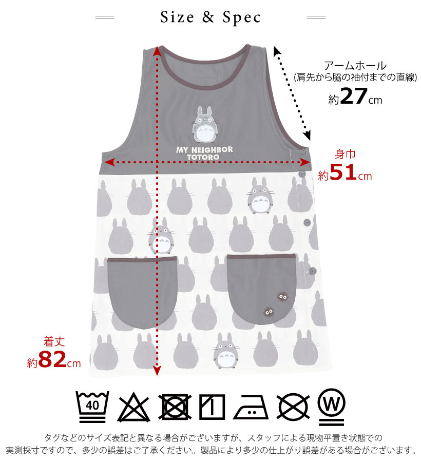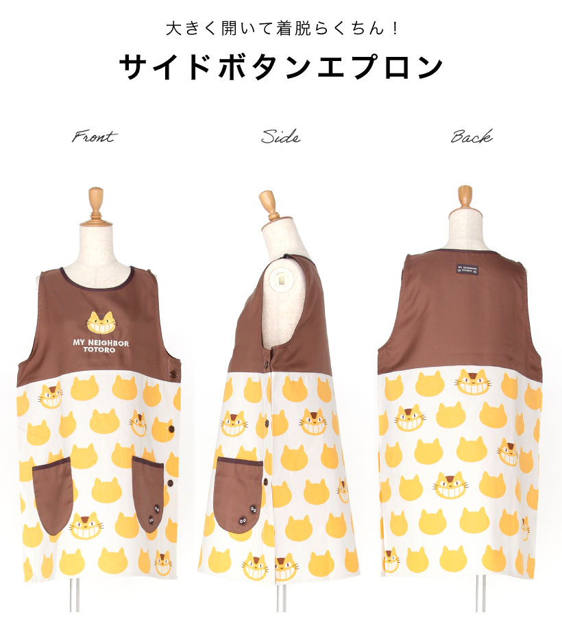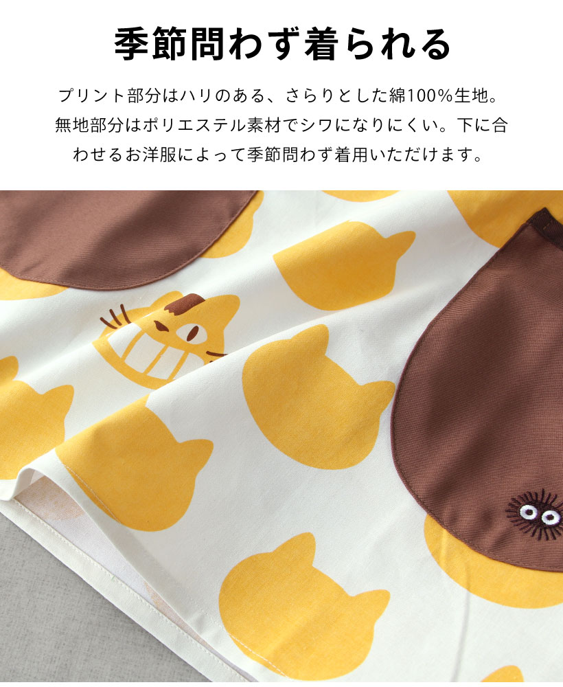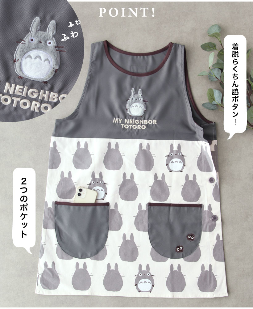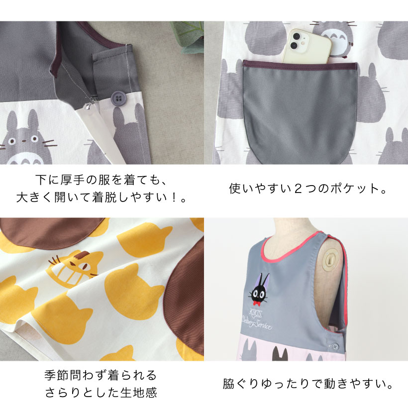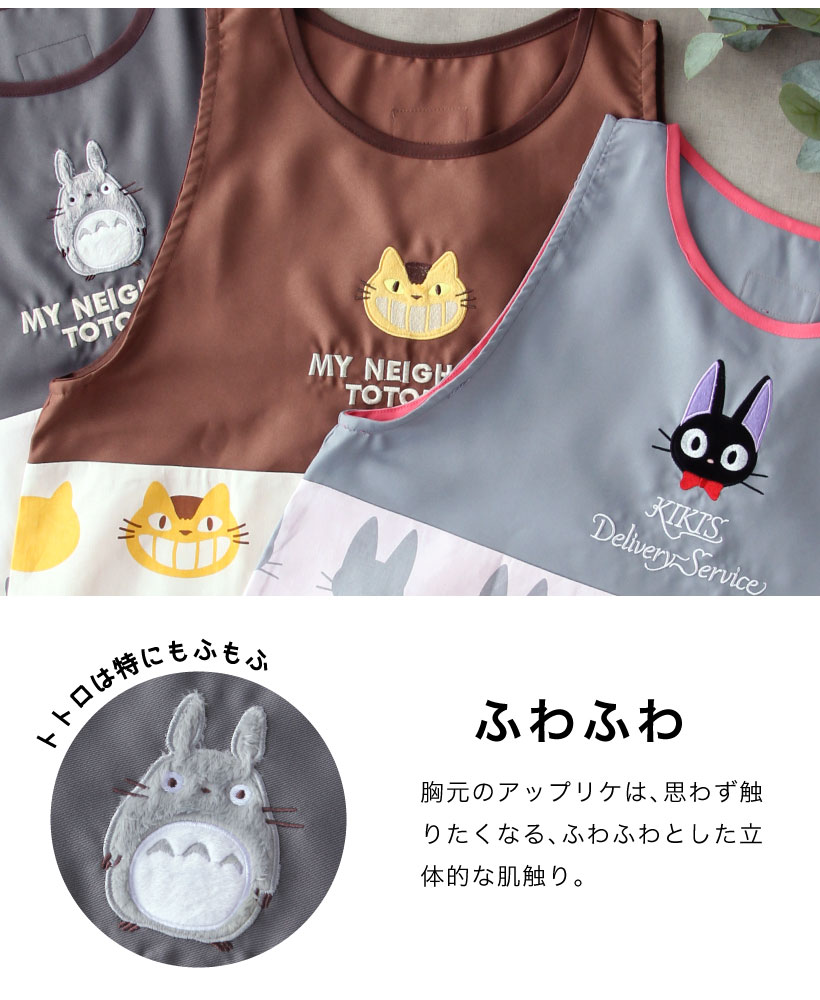 | 大人から子供まで大好きなジブリデザインのエプロン!着脱しやすい、大きく開く脇ボタンタイプ。胸元にはふわふわと、思わず触れたくなるような立体的なアップリケがポイント。子供も喜ぶかわいいデザインは、保育士さんにもおすすめです。 | |