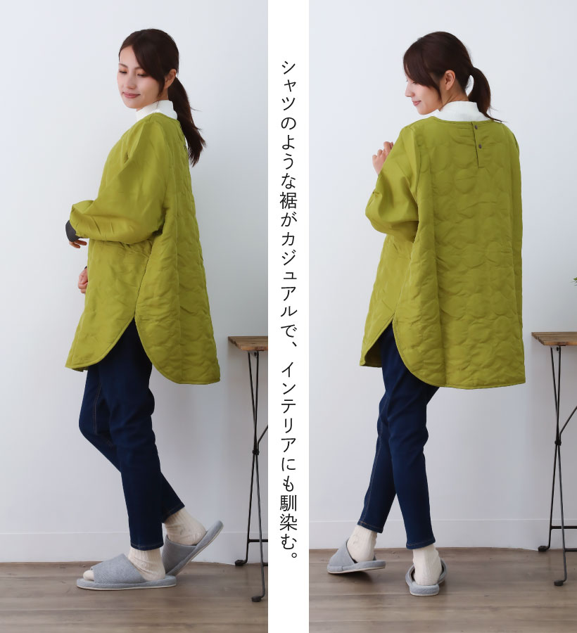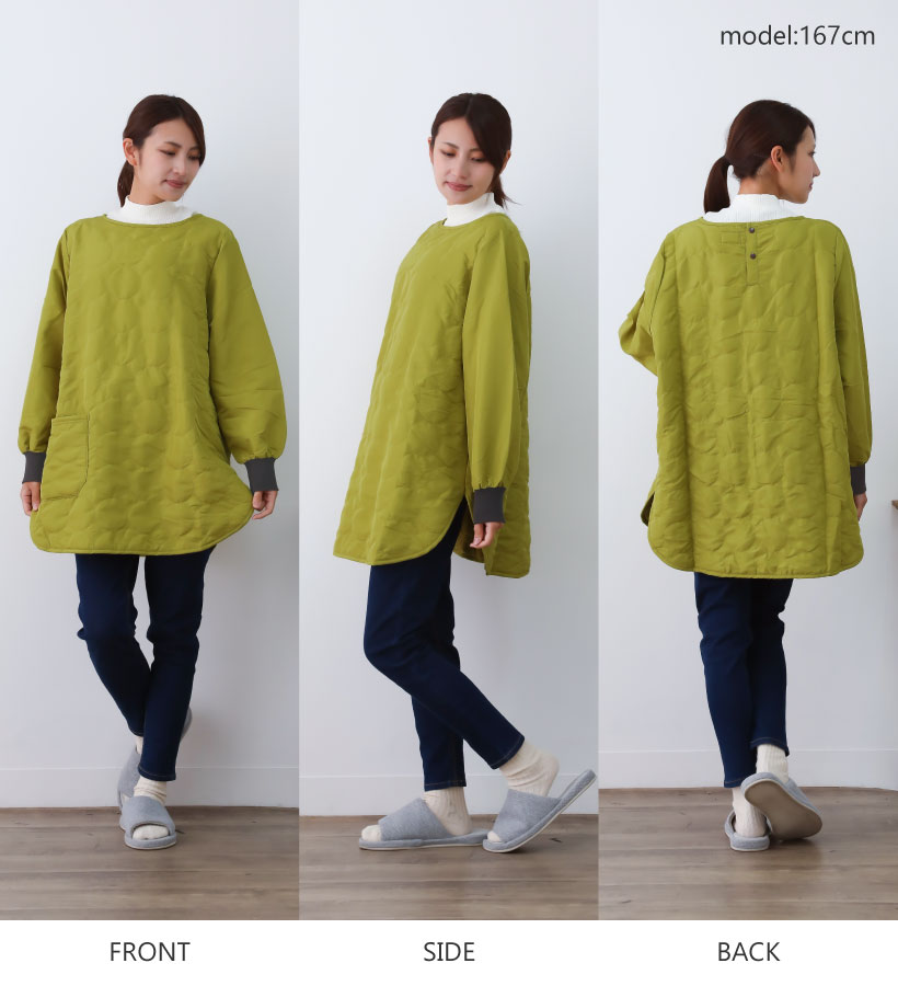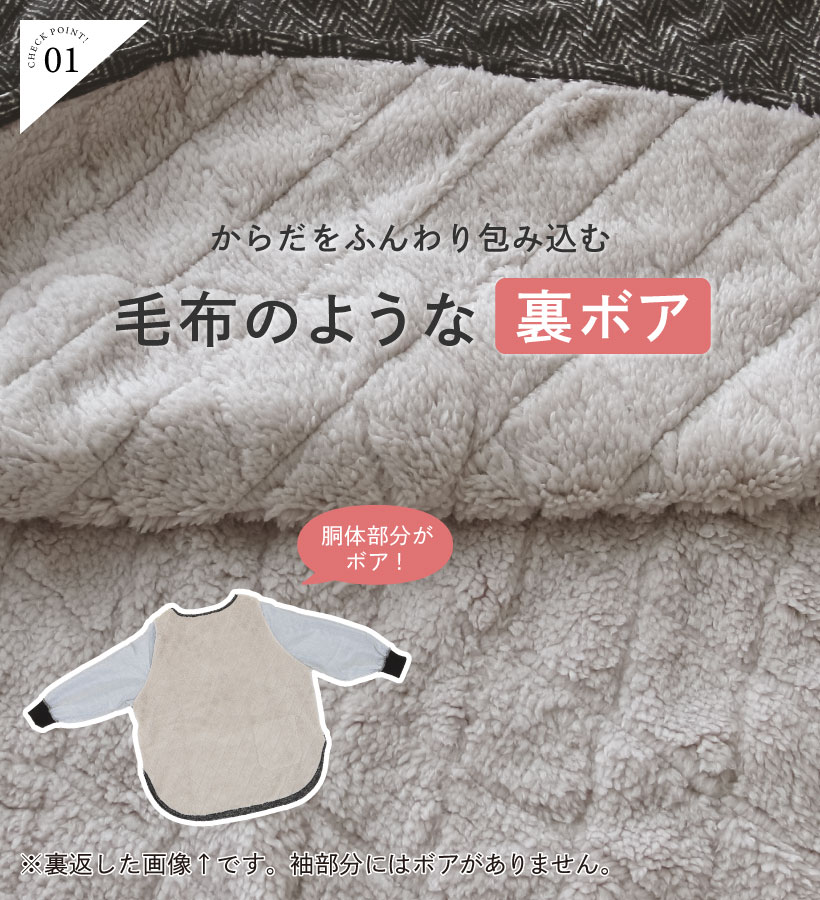 | 着やすくて、暖かい。人気の裏ボア素材のゆったり着れる、おしゃれなかっぽう着。表はキルティングで、裏が暖かいボア素材なので、冬場の家事や、家の中でも暖かくて快適に過ごせます。お部屋の中の防寒着としてもオススメです。 | ||