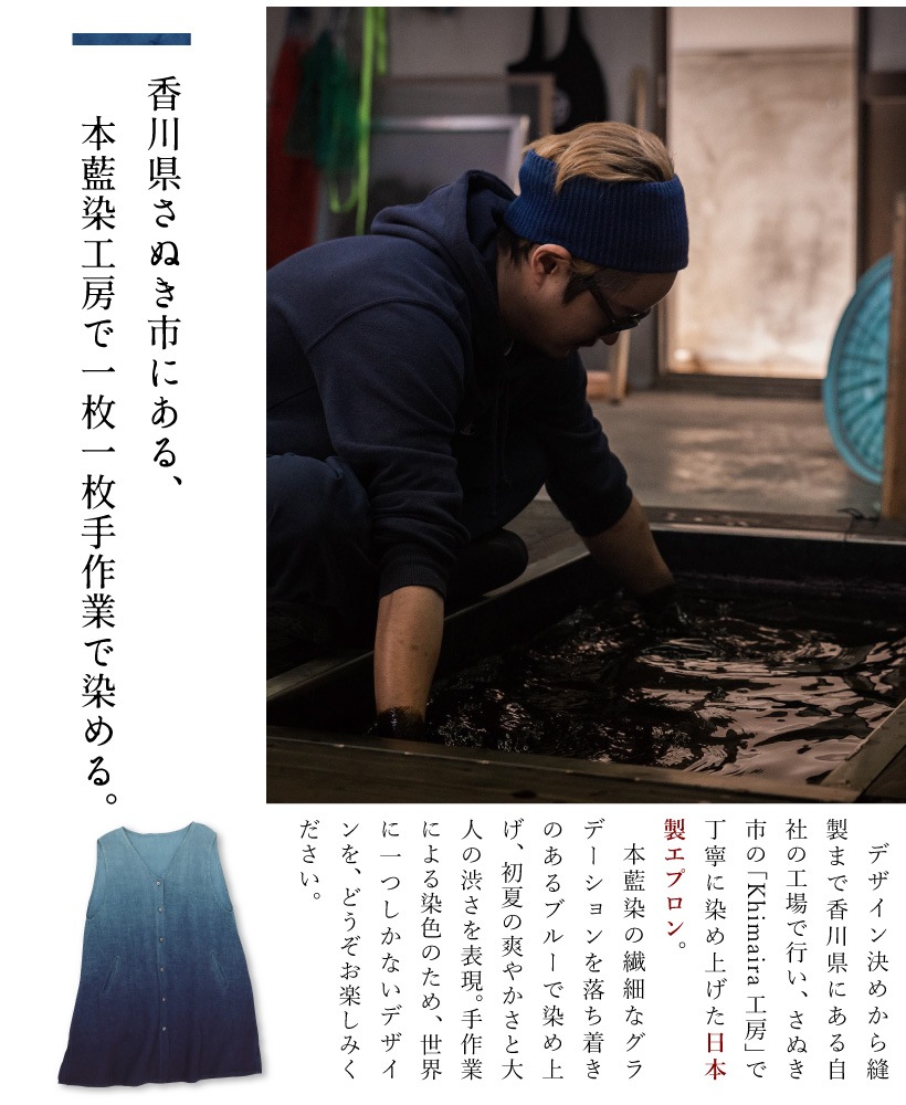| 香川県にある自社工場でデザインから縫製まで行い、さぬき市津田町にある「khimaira工房」にて一枚一枚手作業で染められた、高品質な藍染かっぽうぎ。深く美しい日本の藍色を、ジレ風のお洋服としても着られるタブリエエプロンに仕立てました。母の日や誕生日のプレゼントにおすすめです。 | ||