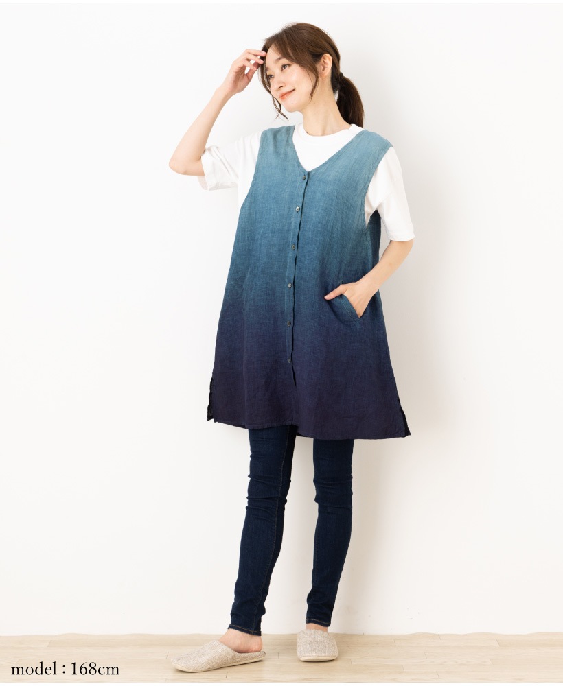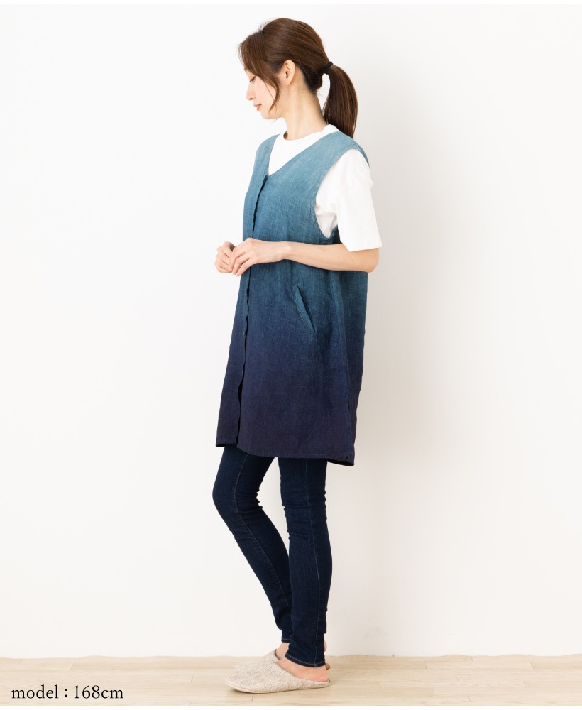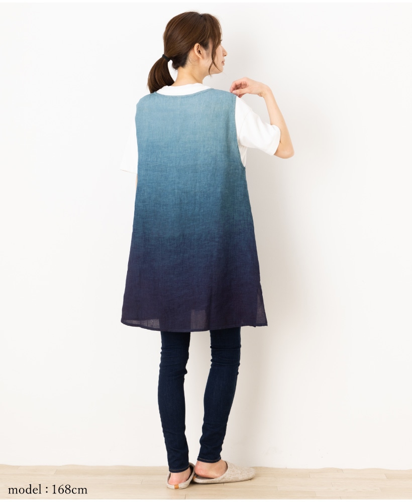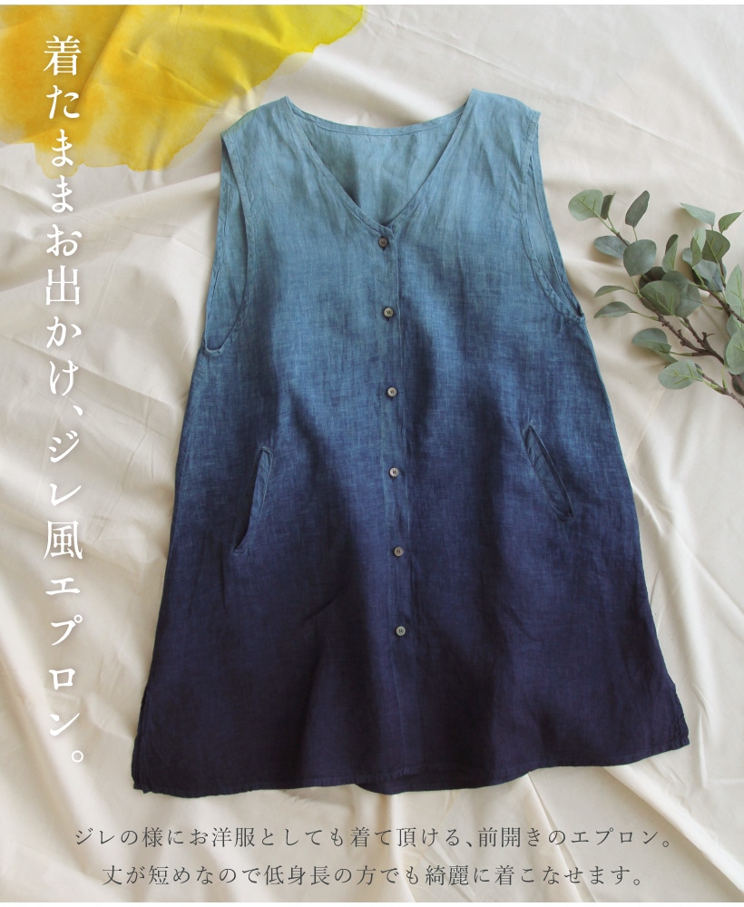 | 藍染 藍染め 本藍染 藍色 グラデーション タブリエ カバー ジレ ベスト 袖なし エプロン 夏 ひざ上 ショート 短い ポケット 大人 女性 ミセス 30代 40代 50代 60代 70代 母の日 プレゼント ギフト 麻 リネン | ||