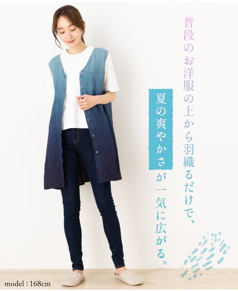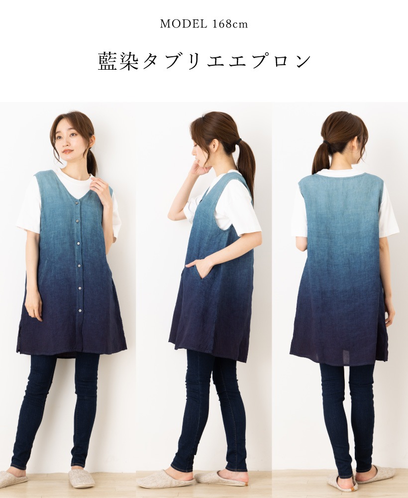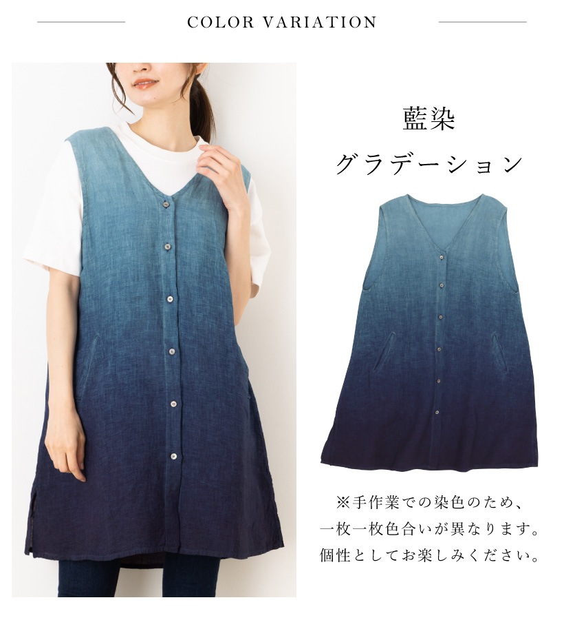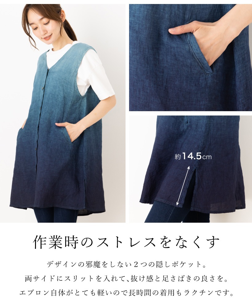 | 藍染 藍染め 本藍染 藍色 グラデーション タブリエ カバー ジレ ベスト 袖なし エプロン 夏 ひざ上 ショート 短い ポケット 大人 女性 ミセス 30代 40代 50代 60代 70代 母の日 プレゼント ギフト 麻 リネン | ||