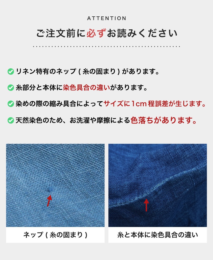| ●写真の関係で実際の商品と色合いが異なることがございます。 ●染めの生地のため、色の濃さに違いが出ることがあります。 ●色ムラの原因になりますので、濡れたまま長時間放置しないでください。 ●火気に近づけますと、繊維が溶けたり、燃えたりする恐れがあります。やけどの心配がありますので充分にご注意をお願いします。 ●洗濯の際は、漂白剤を使用しないで下さい。 ●生成りやパステルカラー等の淡色製品には蛍光増白剤が入っていない洗剤を使用して下さい。色が変わることがあります。 ●濃色製品は色落ちする恐れがありますので単独で洗って下さい。 ●長時間濡れたままにしておきますと、色が移る心配がありますのでご注意下さい。 ●洗濯後は、ゆるく絞り、すぐに形を整えて日陰に干して下さい。 ●タンブル乾燥はしないで下さい。 ○藍染の洗い方 藍染の製品は水またはぬるま湯で、手洗いか手押し洗いをおすすめ致します。 洗濯機で洗うのもいいが、色移りがしやすいので他の衣類とは別に洗濯してください。 ○藍染の保管方法 直射日光の当たらない場所で保管してください。 強く擦れると他の衣類に色が移るので、できれば藍染だけで、少なくとも色の薄いものとは一緒に保管しないことが好ましいです。 |