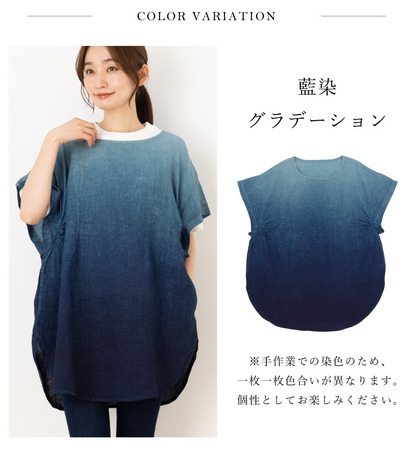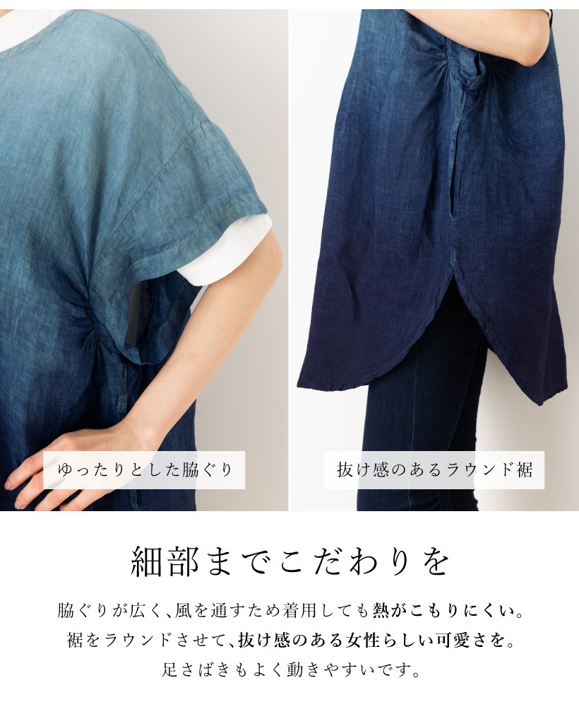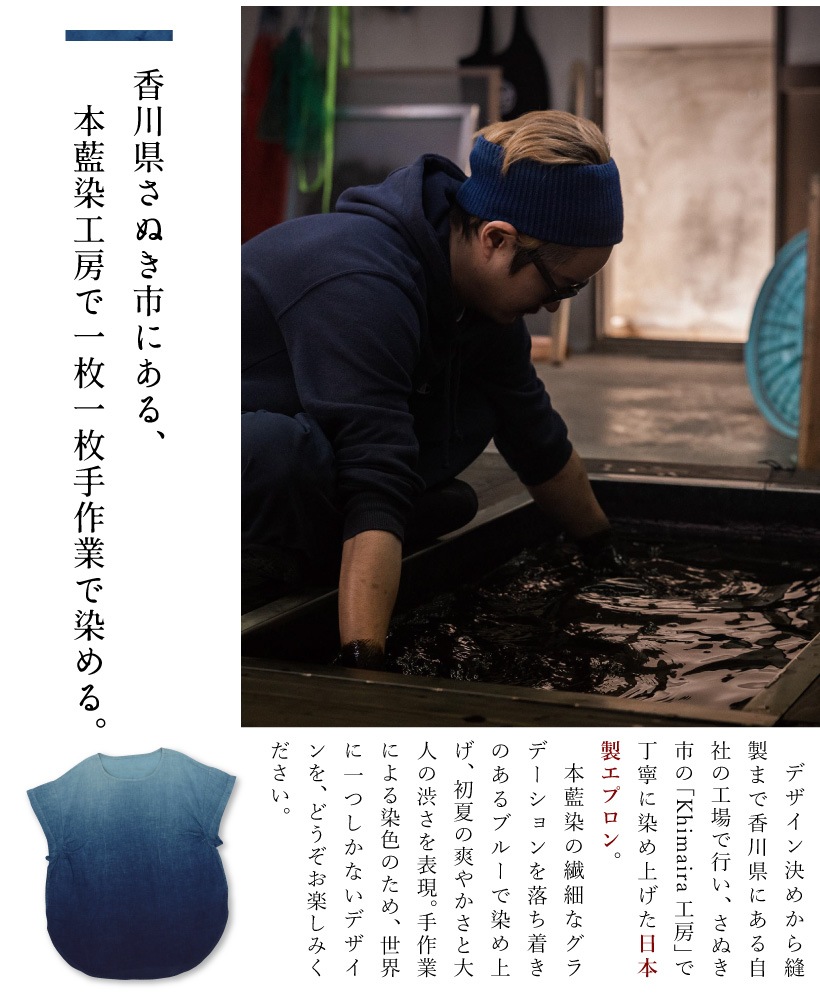 | 香川県にある自社工場でデザインから縫製まで行い、さぬき市津田町にある「khimaira工房」にて一枚一枚手作業で染められた、高品質な藍染かっぽうぎ。爽やかなブルーのグラデーションに、軽やかなリネン生地が夏に涼しさを与えてくれます。母の日や誕生日のプレゼントにおすすめです。 | ||