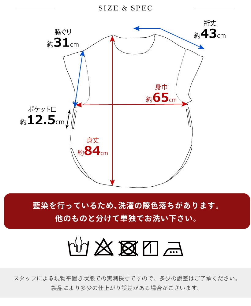 | ●写真の関係で実際の商品と色合いが異なることがございます。 ●染めの生地のため、色の濃さに違いが出ることがあります。 ●色ムラの原因になりますので、濡れたまま長時間放置しないでください。 ●火気に近づけますと、繊維が溶けたり、燃えたりする恐れがあります。やけどの心配がありますので充分にご注意をお願いします。 ●洗濯の際は、漂白剤を使用しないで下さい。 ●生成りやパステルカラー等の淡色製品には蛍光増白剤が入っていない洗剤を使用して下さい。色が変わることがあります。 ●濃色製品は色落ちする恐れがありますので単独で洗って下さい。 ●長時間濡れたままにしておきますと、色が移る心配がありますのでご注意下さい。 ●洗濯後は、ゆるく絞り、すぐに形を整えて日陰に干して下さい。 ●タンブル乾燥はしないで下さい。 ○藍染の洗い方 藍染の製品は水またはぬるま湯で、手洗いか手押し洗いをおすすめ致します。 洗濯機で洗うのもいいが、色移りがしやすいので他の衣類とは別に洗濯してください。 ○藍染の保管方法 直射日光の当たらない場所で保管してください。 強く擦れると他の衣類に色が移るので、できれば藍染だけで、少なくとも色の薄いものとは一緒に保管しないことが好ましいです。 |