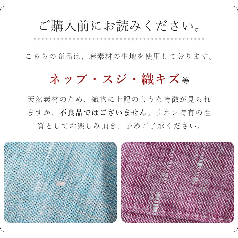 | ●写真の関係で実際の商品と色合いが異なることがございます。 ●火気に近づけますと、繊維が溶けたり、燃えたりする恐れあります。やけどの心配がありますので十分にご注意ください。 ●洗濯の際は漂白剤を使用しないで下さい。 ●生成りやパステルカラー等の淡色製品には、蛍光増白剤が入っていない洗剤を使用してください。色が変わる恐れがあります。 ●濃色製品は色落ちする恐れがありますので、単品で洗って下さい。 ●長時間濡れたままにしておきますと、移色する恐れがあります。 ●洗濯後は緩く絞り、すぐに形を整え日陰に干してください。 ●タンブル乾燥はしないで下さい。 |