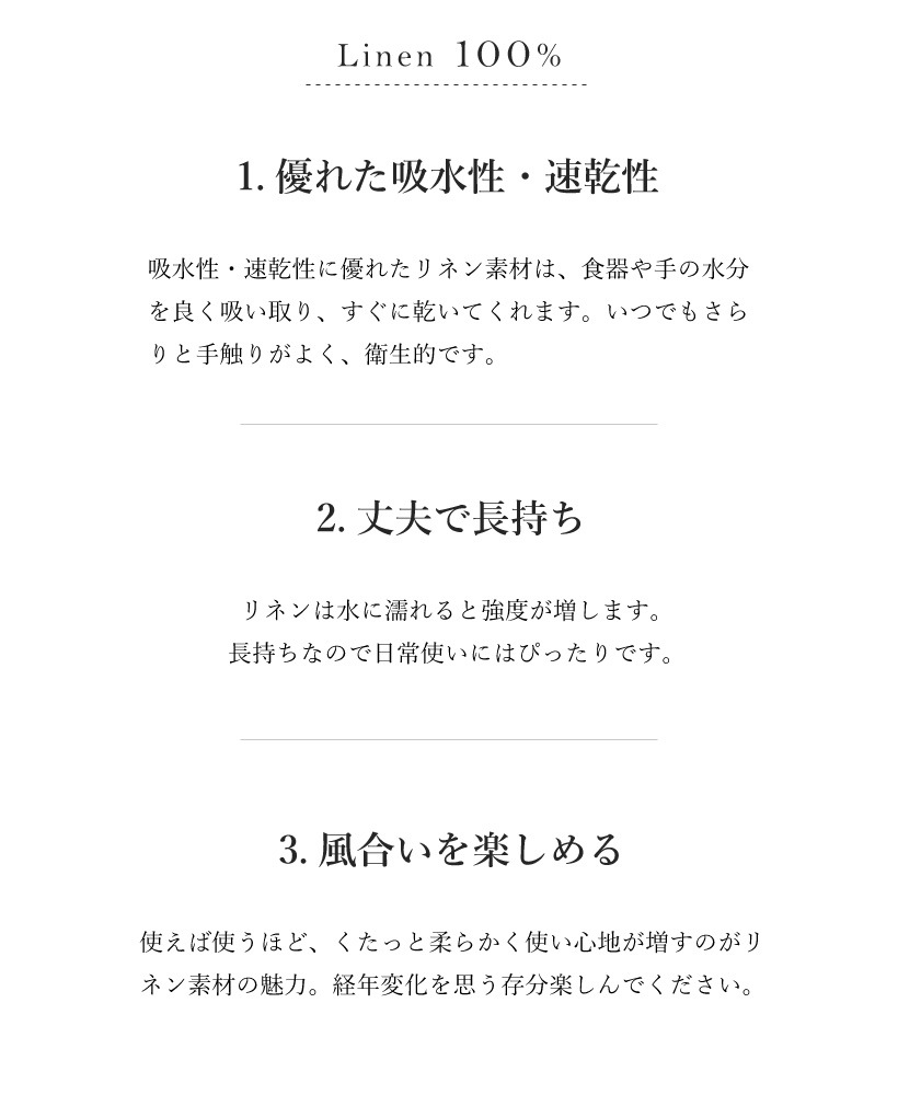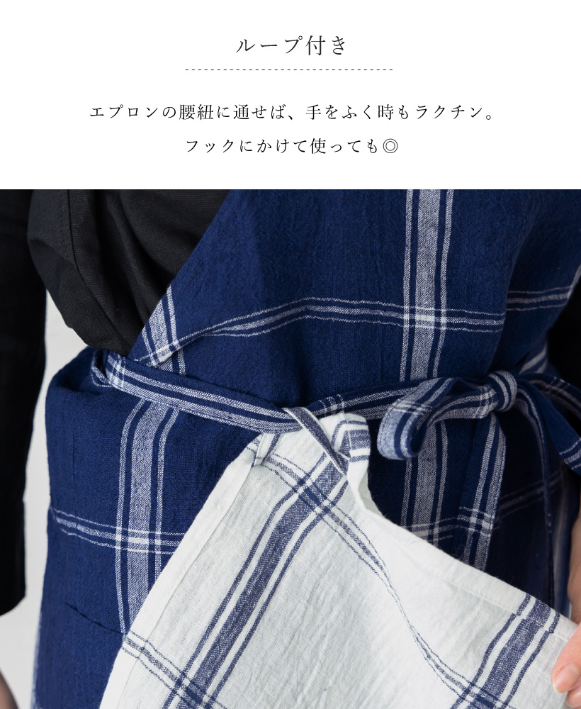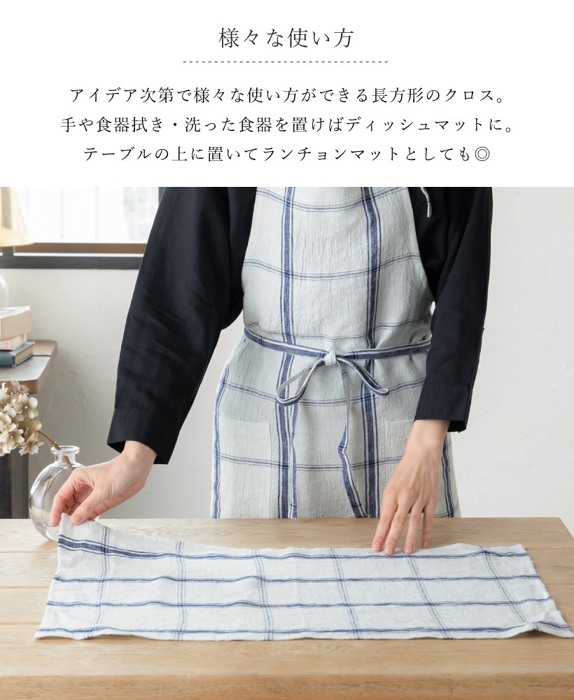 | ループ付きが嬉しい、キッチンクロス。エプロンの腰紐に通せば、手拭きタオルとしても。シンプルなデザインは日常使いにぴったり。長方形なのでランチョンマットや、ディッシュクロスにも。香川県の縫製工場でつくる高品質なキッチンクロス。使い込むほどくったり柔らかく変化するリネン素材をお楽しみください。 | ||