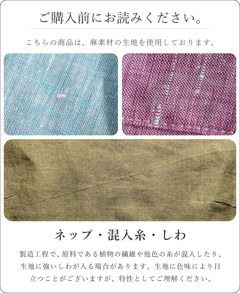 | ●写真の関係で実際の商品と色合いが異なることがございます。 ●火気に近づけますと、繊維が溶けたり、えたりする恐れがあります。やけどの心配がありますので充分にご注意をお願いします。 ●洗濯の際は、漂白剤を使用しないで下さい。 ●生成りやパステルカラー等の淡色製品には蛍光増白剤が入っていない洗剤を使用して下さい。色が変わることがあります。 ●濃色製品は色落ちする恐れがありますので単独で洗って下さい。 ●長時間濡れたままにしておきますと、色が移る心配がありますのでご注意下さい。 ●洗濯後は、ゆるく絞り、すぐに形を整えて日陰に干して下さい。 ●タンブル乾燥はしないで下さい。 |