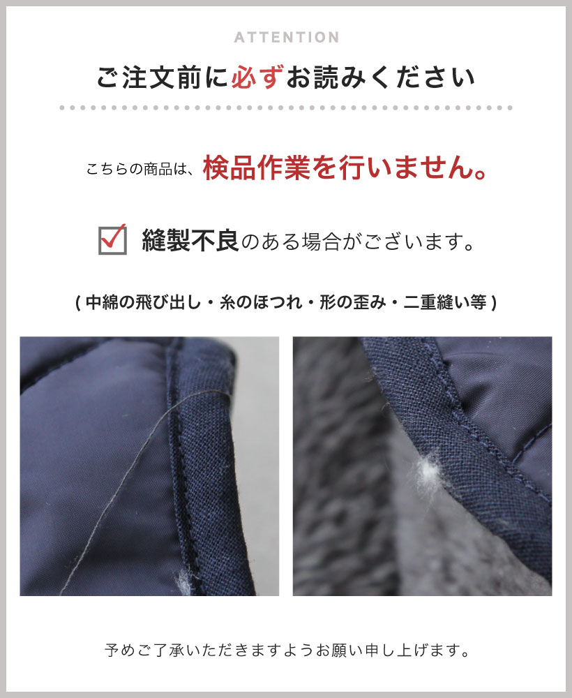 | 【撥水加工について】 ●この商品の表生地には水汚れに強い撥水加工を施しています。 ●撥水加工は永久的なものではありませんので繰り返しの使用により撥水加工が低下する場合がございます。また長時間のご利用や高水圧には対応しかねますのでご注意ください。 ●効果を持続させるためにも、市販の防水スプレーをご使用いただくとより効果を発揮します。 ●写真の関係で実際の商品と色合いが異なることがございます。 ●この商品は表面を起毛にしている為、摩擦や洗濯によって毛並みが乱れる事があります。 ●洗濯により、多少の縮みや型くずれが発生する場合があります。 ●長時間水に浸けておいたり、洗濯後濡れたまま放置しますと色落ちや色移行する恐れがあります。 ●初めは若干色落ちする恐れがありますので、他のものとは別にお洗いください。 ●摩擦や雨や汗などによる濡れた状態での使用は色落ちや色移行の原因となります。ご注意ください。 ●洗濯後は放置せず、直ちに形を整えて風通しのよい日陰に干してください。 ●漂白剤、漂白剤入り洗剤は使用しないでください。 ●ホックやファスナーなど、引っかかりやすいものとは一緒に洗わないでください。 ●商品ごとに風合い、色の出方、サイズ等、微妙に異なります。 ●乱暴なお取り扱いはおやめください。 ●長時間日光に当てると変色の恐れがあります。 ●高温多湿・直射日光を避けて保管してください。 ●火気や暖房器具に近づけないでください。 ●この商品はキルティングを施しているため、表面に若干ボアが抜け出ることがあります。予めご了承ください。 |