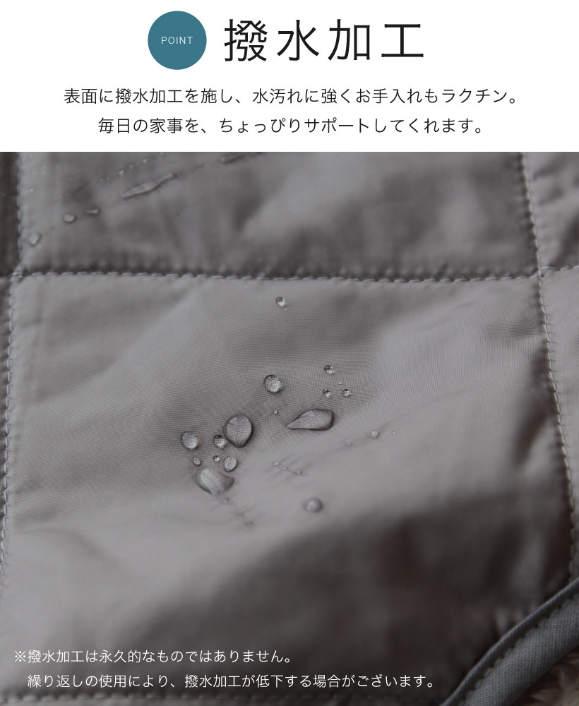 | 表生地に撥水加工を施しており、水を弾いて汚れにくいお手入れラクチンな裏ボアエプロン!。服の上からも着やすいゆったりサイズ。前開きボタンなので着脱しやすい!キルトは中綿入りで、内側はなめらかなボア生地を使用。おしりまで隠れる丈で腰までポカポカ軽くてあったか。スマホも入る便利なポケット付き。節電対策にもおすすめです。 | ||