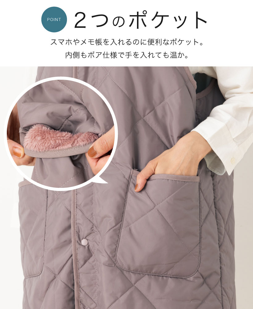 | 袖なし カバー 前開き ボタン ひざ丈 裏ボア ボア 暖か 温か 温かい 暖かい あったか 無地 シンプル おしゃれ かわいい くすみ 大人 ピンク ネイビー グレー ゆったり キルト キルティング 撥水 はっ水 水 弾く 冬 秋 防寒 軽い 軽量 491-1933 | ||