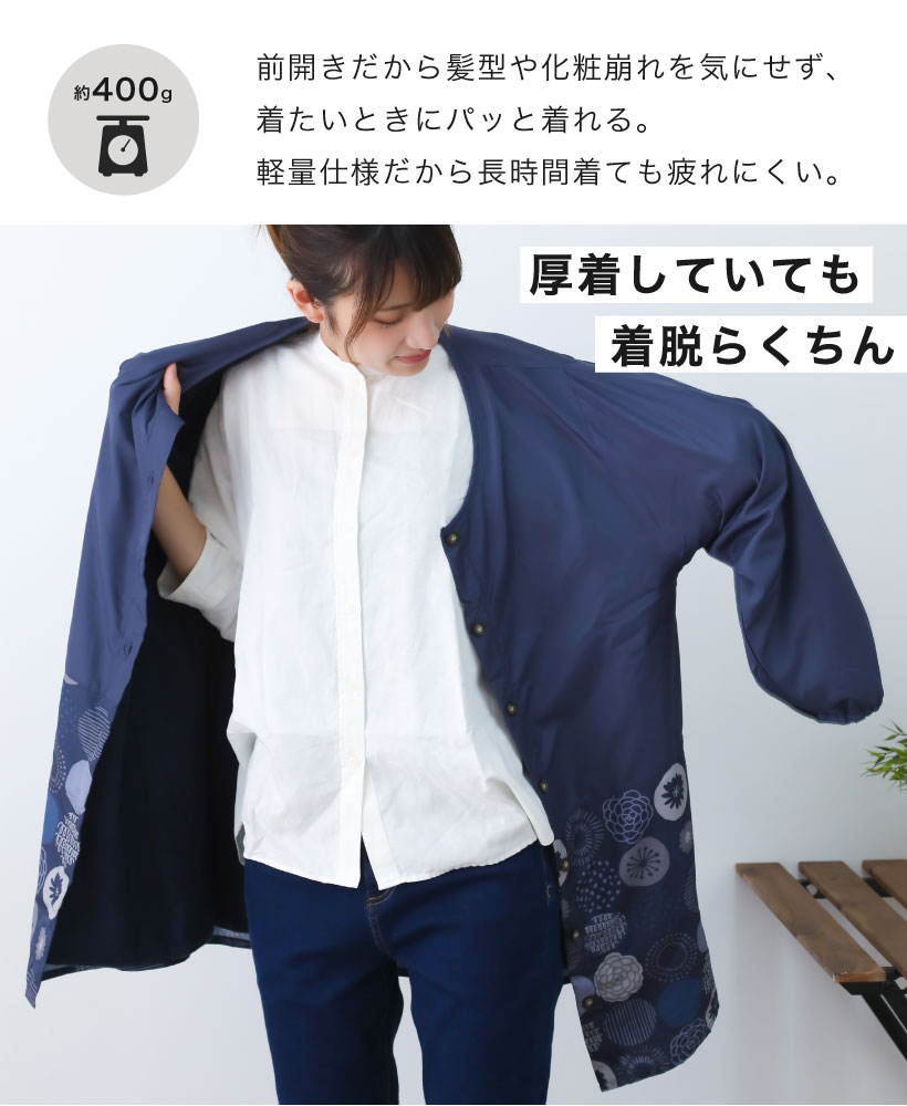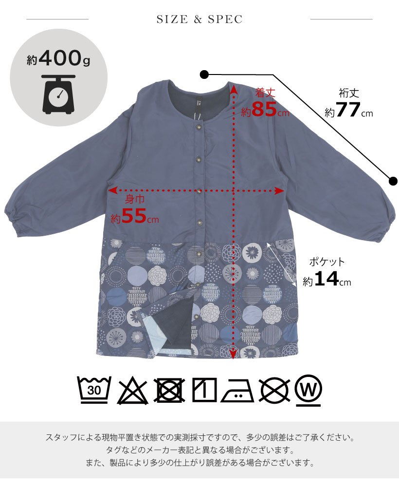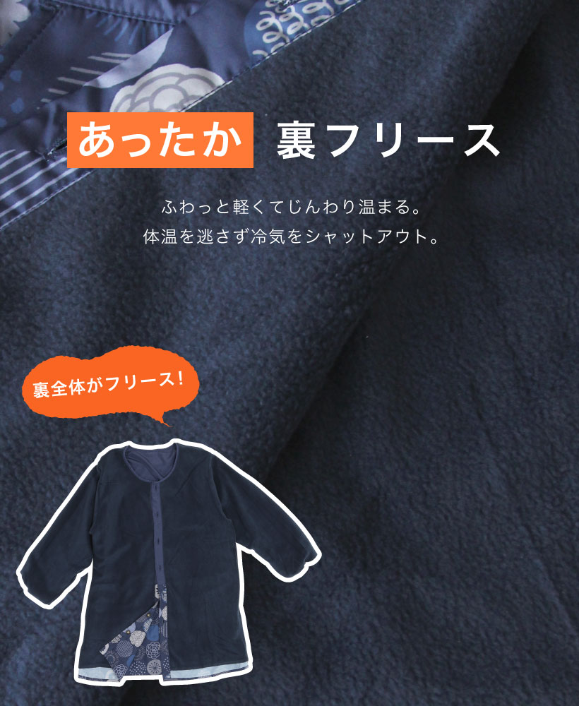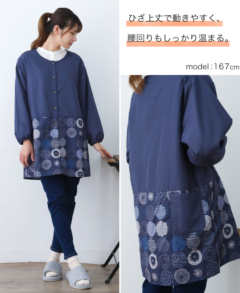 | 着やすくて暖かい、裏フリース素材のゆったり着れるかっぽう着です。大人可愛い北欧柄のおしゃれ割烹着!表は撥水加工で、裏が暖かいフリース素材なので、冬場の家事や、家の中でも暖かくて快適に過ごせるので部屋の中の防寒着としてもオススメ。 | ||
