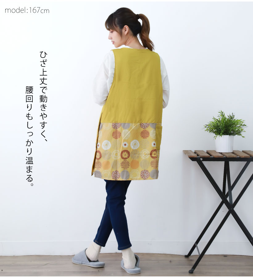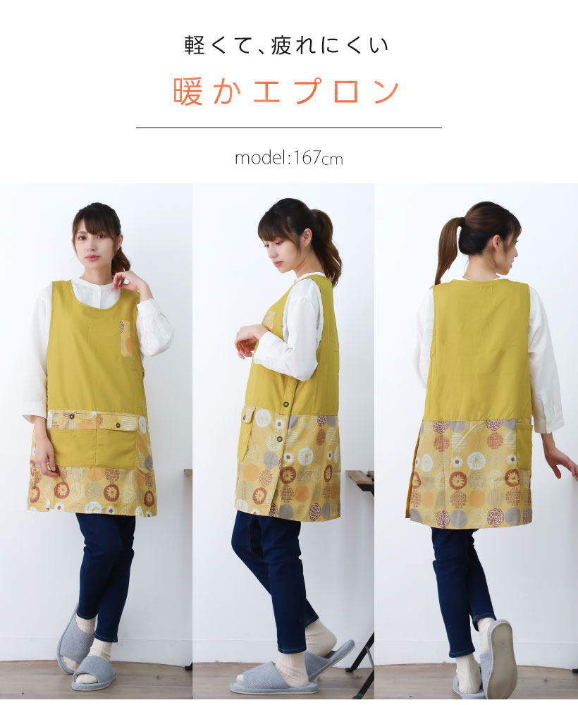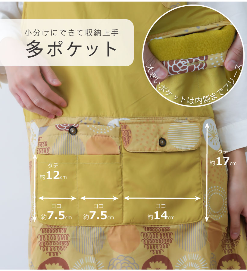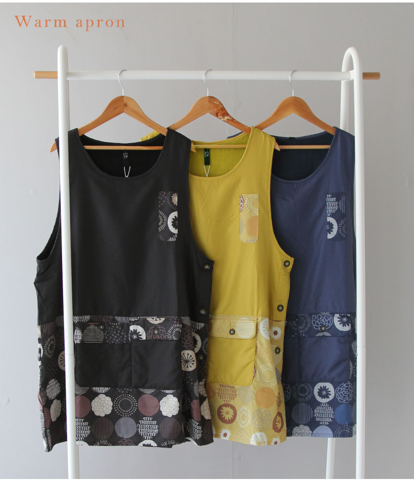 | ふんわり裏フリースの暖かカバーエプロン。撥水加工でお手入れカンタン、多ポケットでデイリーに使いやすいエプロンです。サイドボタンで大きく開くので、下に厚手の服を着ても着脱しやすく、袖口もゆったり広めで作業時、腕を動かしやすい仕様になっています。大切な人へのギフトやプレゼントにもおすすめです。 | ||