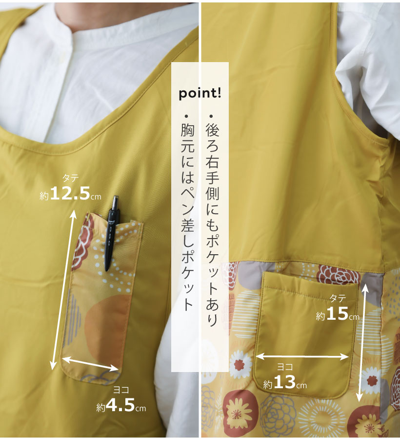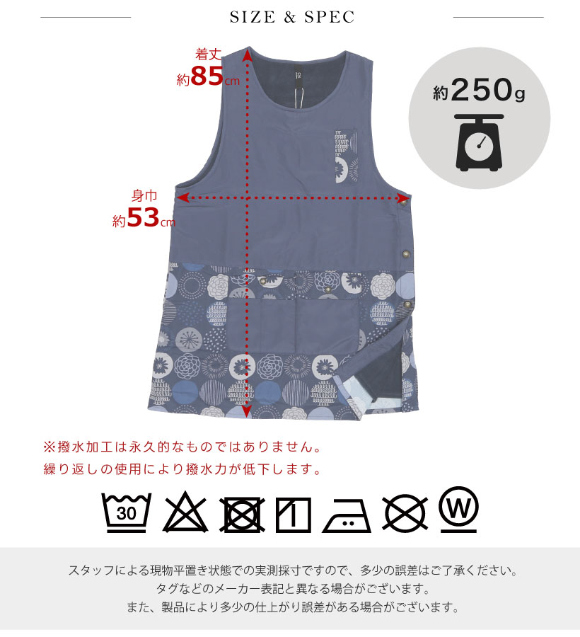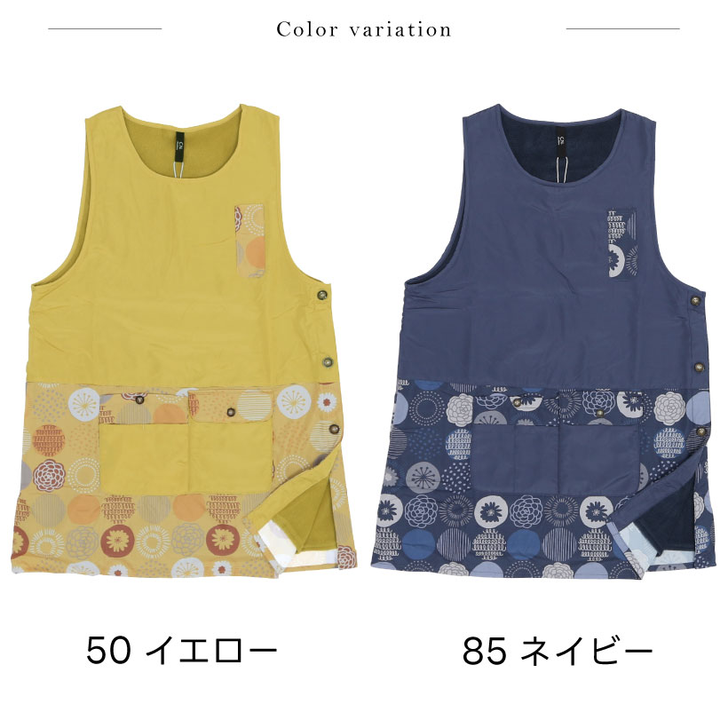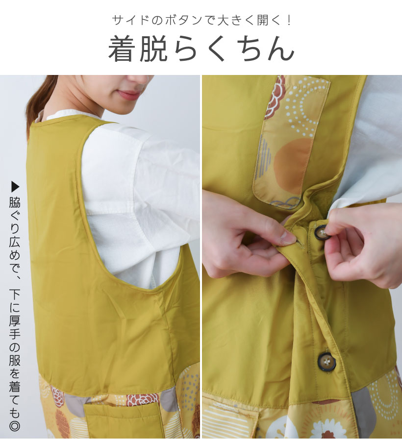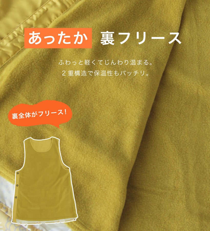 | ふんわり裏フリースの暖かカバーエプロン。撥水加工でお手入れカンタン、多ポケットでデイリーに使いやすいエプロンです。サイドボタンで大きく開くので、下に厚手の服を着ても着脱しやすく、袖口もゆったり広めで作業時、腕を動かしやすい仕様になっています。大切な人へのギフトやプレゼントにもおすすめです。 | ||