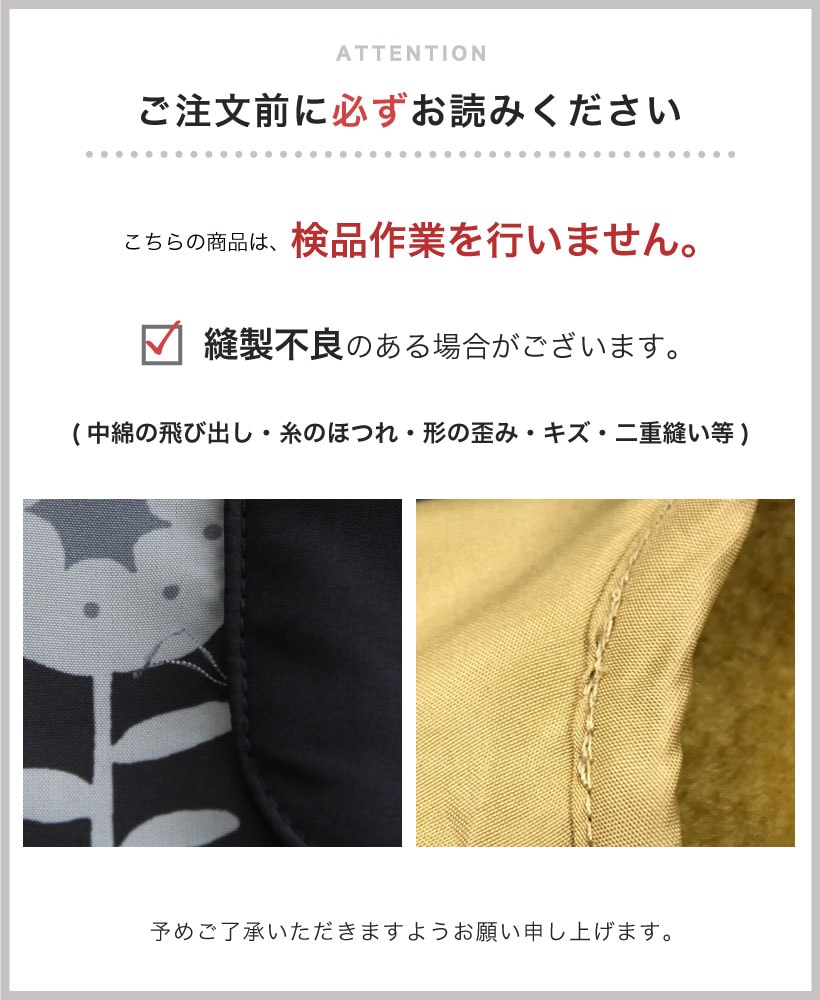 | ●写真の関係で実際の商品と色合いが異なることがございます。 ●この商品は、火気に近づくと溶解する恐れがあります。火気をご使用の際は充分ご注意下さい。 ●プリント部分は、色落ちすることがありますのでご注意下さい。アイロンをかける際には必ずあて布をして下さい。直接かけると、変質・変色の恐れがあります。 ●素材の特性上、引っ掛けが生じ易いので、着用・着脱時、突起物に引っ掛からないようにご注意下さい。 ●素材の特性上、裏地生地を起毛にしている為、他の衣服に毛羽が付いたり、毛足が倒れ変色したように見える場合があります。 ●着用中の摩擦や洗濯により、ピリング(毛玉)が生じる事があります。ピリングが発生しましたら、引っ張らずにブラッシングするか、小バサミ等で丁寧に取り除いて下さい。 ●洗濯により、多少の縮みがありますので、あらかじめご了承下さい。 ●洗濯の際、色落ちをする場合がありますので他のものと一緒に洗わず、単独で洗って下さい。また、ネットを使用して下さい。 ●蛍光増白剤配合洗剤・漂白剤(塩素系、酸素系、還元系)は、使用しないで下さい。変色する恐れがあります。 ●脱水しわが残ることがありますので、遠心脱水は短めにして下さい。 ●家庭洗濯時、タンブラー乾燥機は使用しないで下さい。 ●洗濯により、収縮やねじれ、型くずれすることがあります。形を整えて、すぐに干して下さい。 ●裏地部分へのアイロンはお避け下さい。ただし、表面からあて布をした上でなら、低温でアイロン掛けできます。フリースへ直接かけると、変質・変色の恐れがあります。 ●長時間、光に当たると変色する恐れがありますので、ご了承下さい。 ●着用の際、縫い目に過度の力が加わると、縫い目が開いてしまうことがあります。ご注意下さい。 | ||