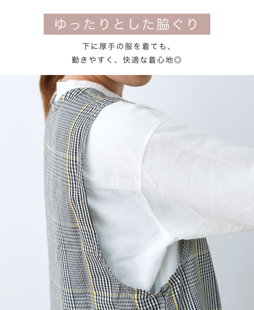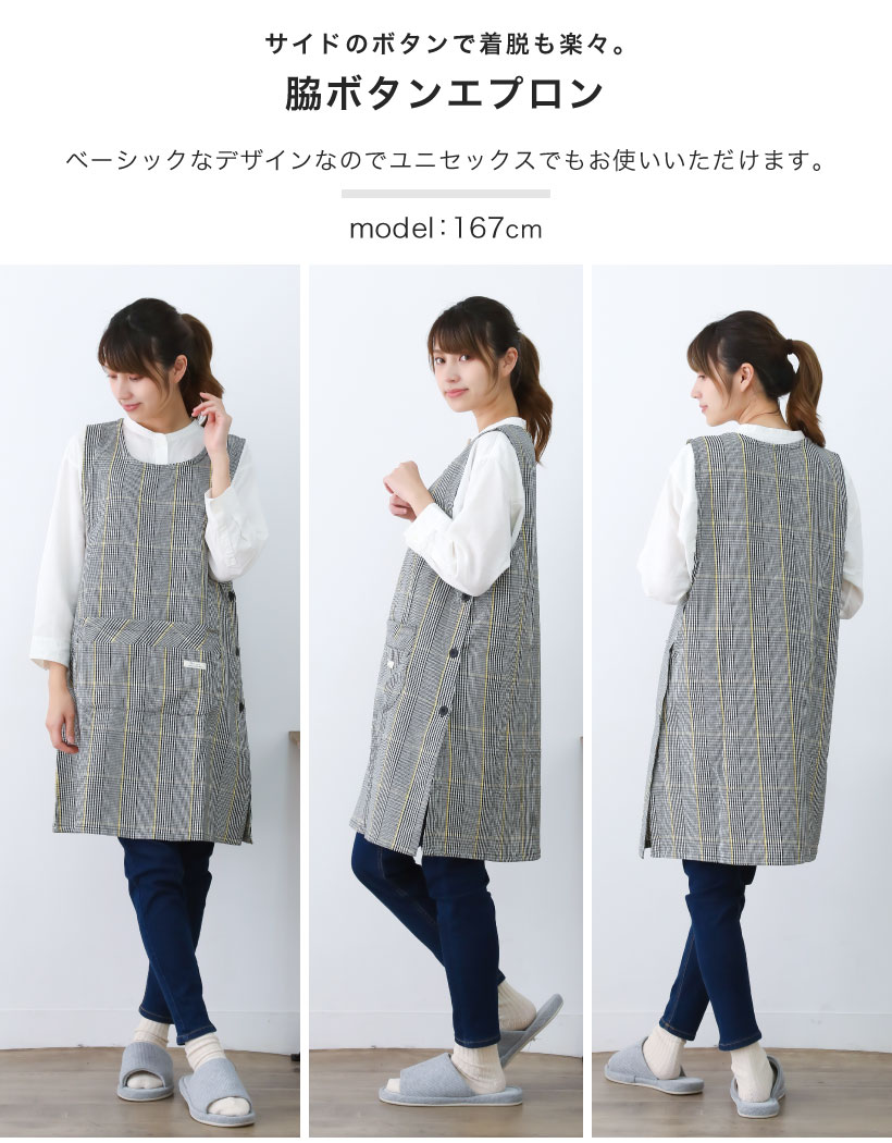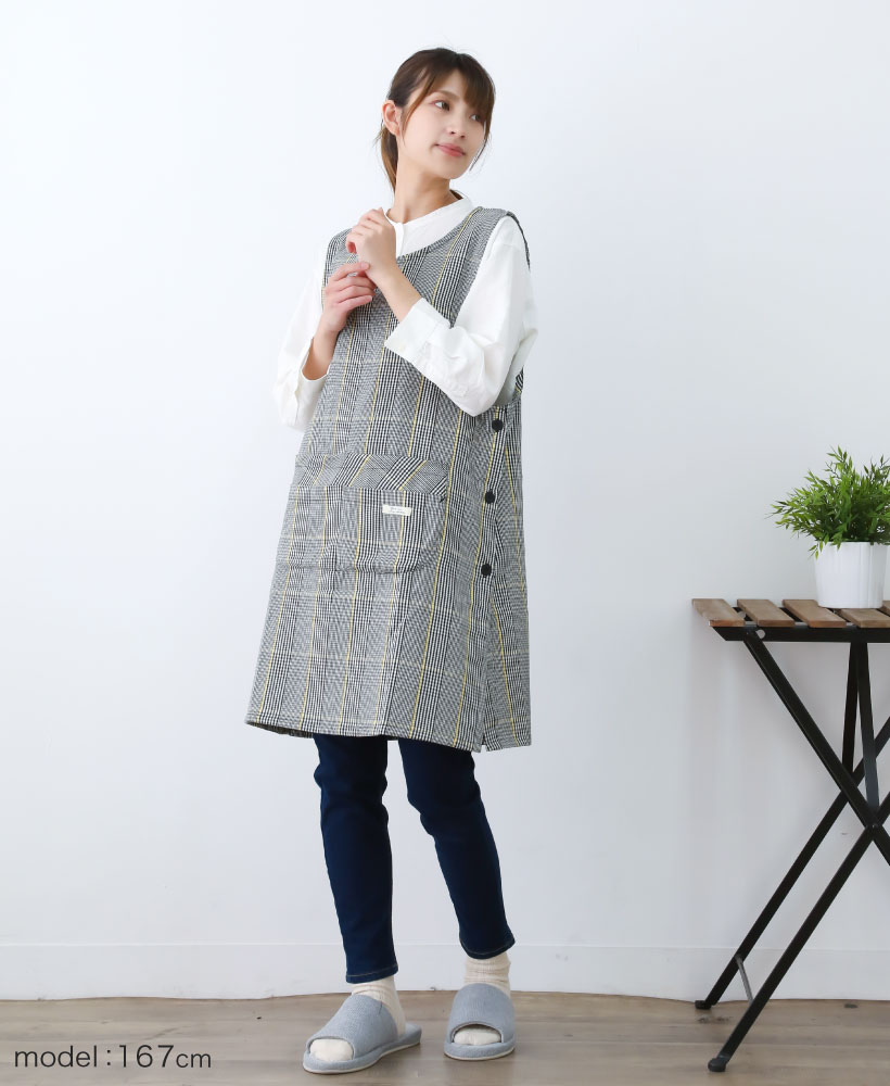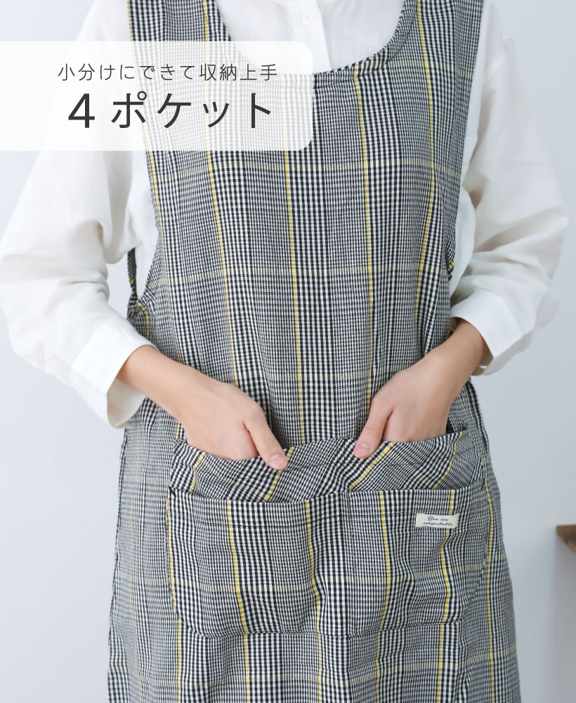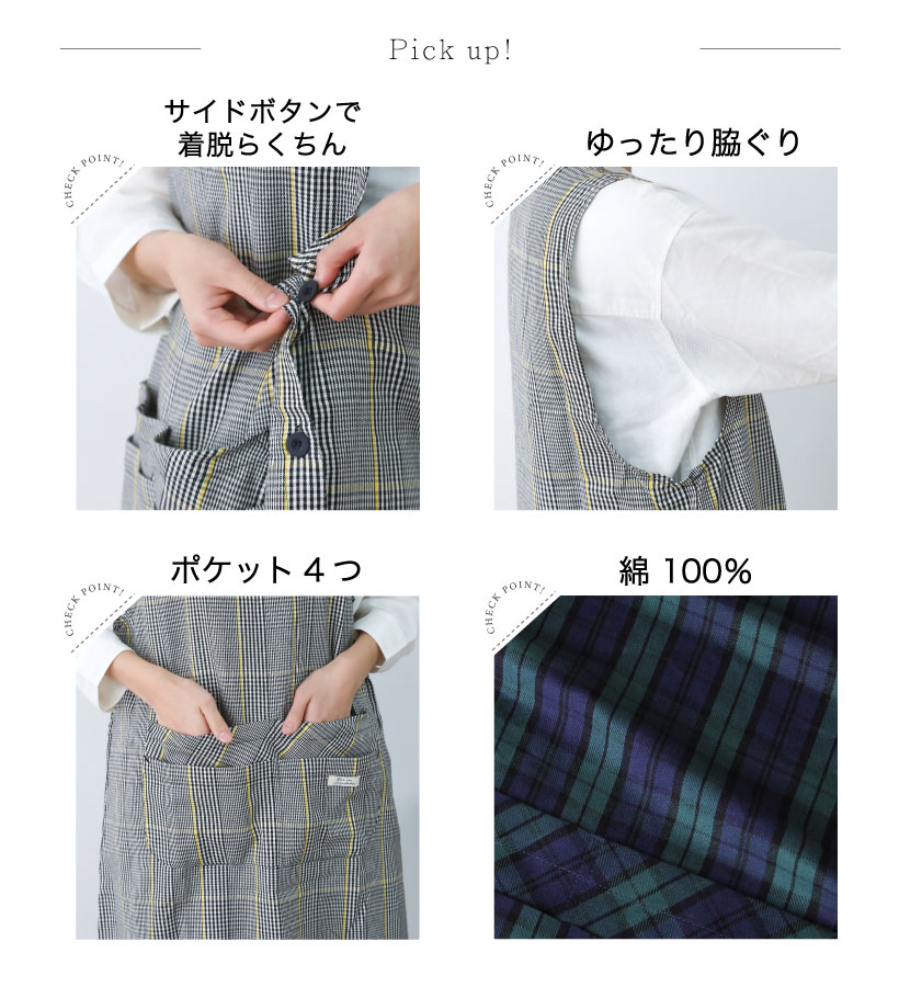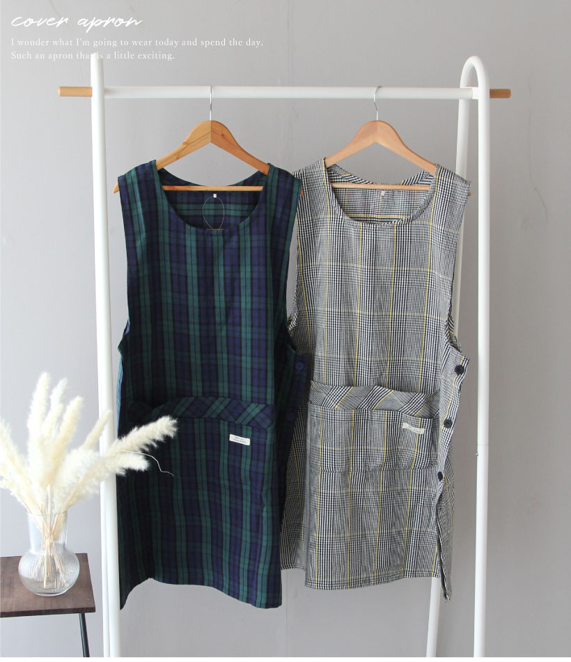 | 2種類のチェック柄を取り揃えた脇ボタンエプロン。 落ち着いたカラー展開にシンプルな柄デザインなので、ユニセックスでもお使いいただけます。 スマホがすっぽり入って使いやすい4つのポケットに、動きやすい丈感で使いやすさもバッチリ。 | ||