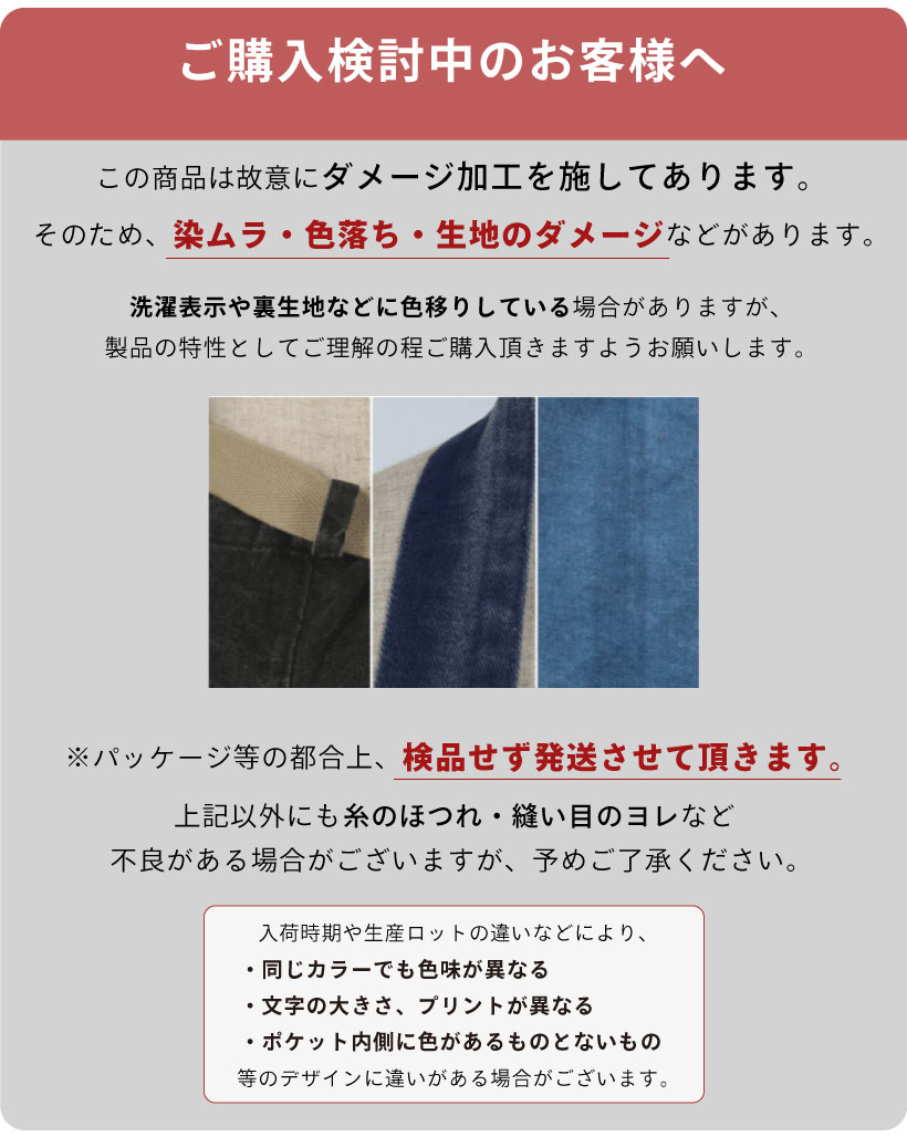 | ●写真の関係で実際の商品と色合いが異なることがございます。 ●この商品は顔料プリントに製品ウォッシュ加工を施しています。そのため表情に個体差があり、一部過度な色落ちをしている製品もありますが、生産工程上避けられない為、購入の際はあらかじめご了承下さい。 また、プリントが濃色の場合、洗濯表示や裏生地などのプリント箇所以外に色移りしていることがありますが、製品の特性としてご理解下さい。 ●商品にはウォッシュ加工によるシワやヨレがあり、サイズや色味・風合いにも個体差があります。 ●洗剤により色落ちしますので、必ず単品洗いをして下さい。漂白剤や蛍光増白剤入り洗剤のご使用はおやめ下さい。また、洗濯を繰り返すたびに色が褪せていくことがあります。 ●直射日光や蛍光灯の光で変色する恐れがありますので、洗濯後は裏返して陰干しし、保管にもご注意ください。 ●摩擦(特に湿った状態での摩擦)により、他の衣類に色が移る事がありますのでご注意下さい。 |
