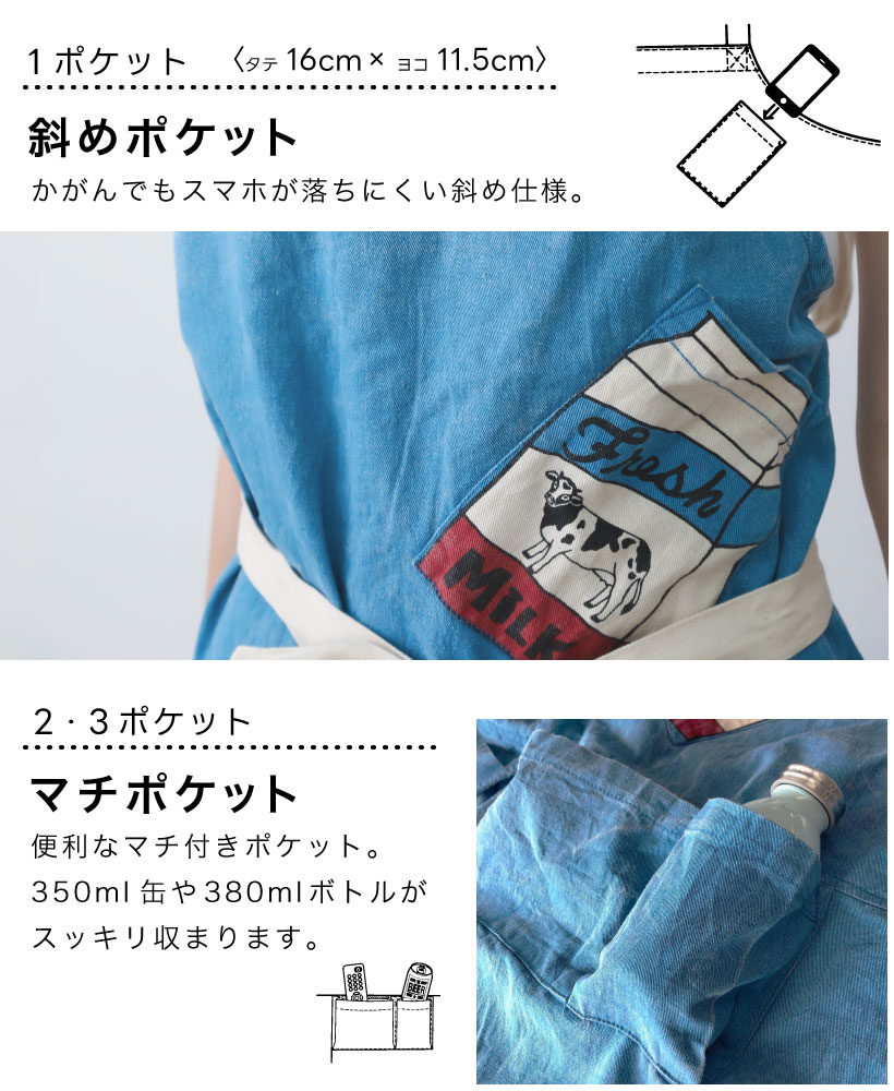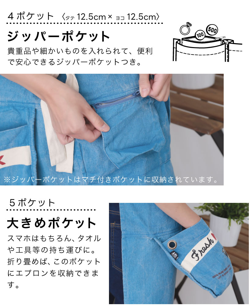 | 5つのポケットつき!しっかりとした綿100%の生地でできた、ポケットにしまってコンパクトに持ち運べる、おしゃれな首掛けエプロン。色落ち感やダメージ感がおしゃれ。男女ともに使えるので便利。アウトドアやDIYなどでも大活躍。ギフトやプレゼントにも人気なパッカブルエプロンです。 | |