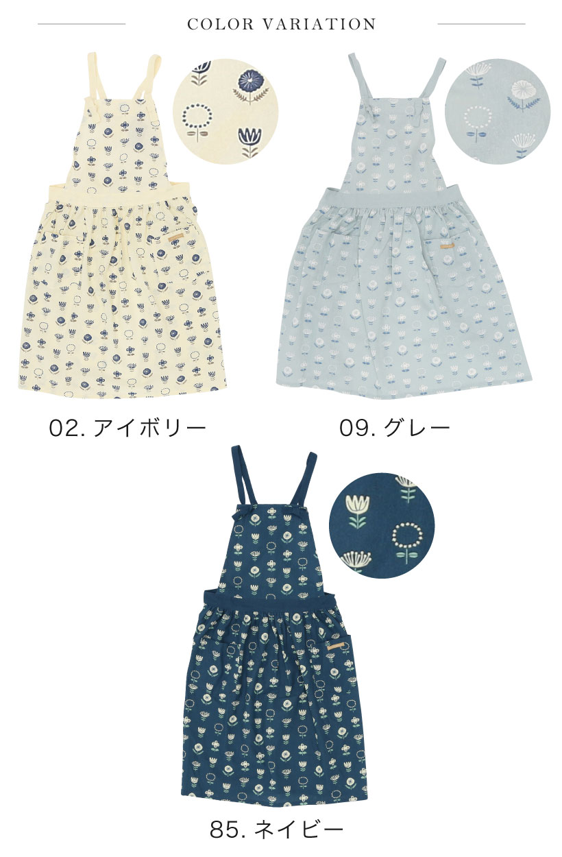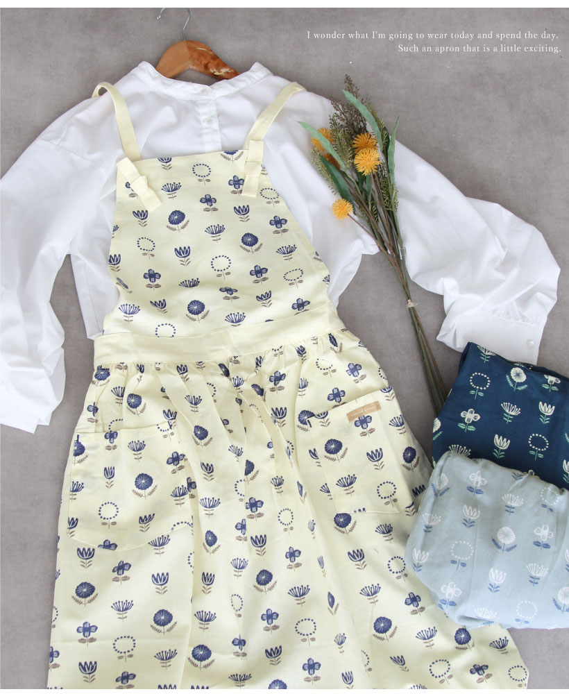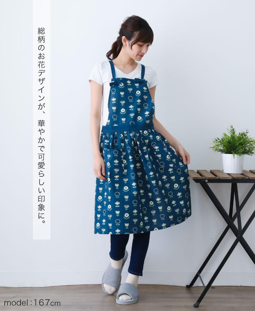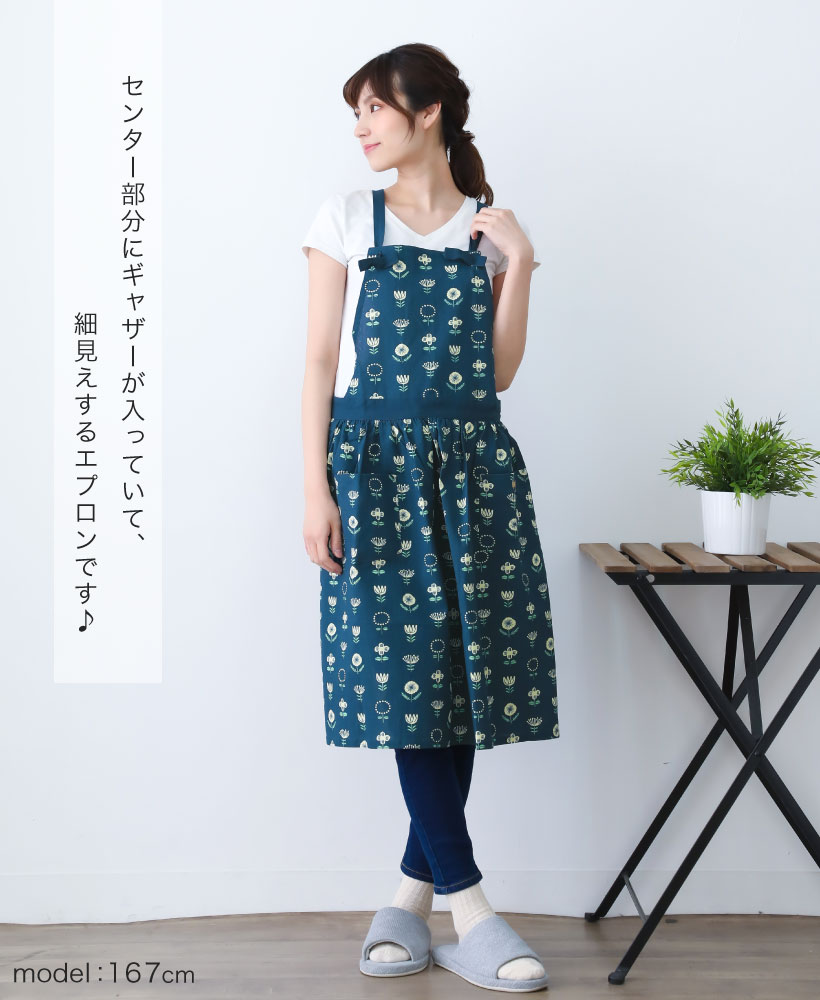 | カジュアルでかわいいお花柄がデザインされたギャザーエプロン。 結び目で肩紐の長さの調整が出来ます。 花のデザインが総柄で入っており、華やかで可愛らしい印象に。 センター部分にギャザーデザインが入っているので、細見えするアイテムです。 | |