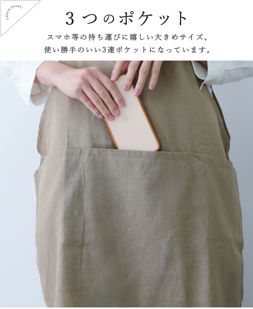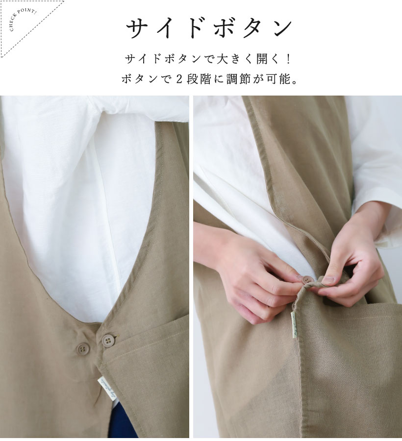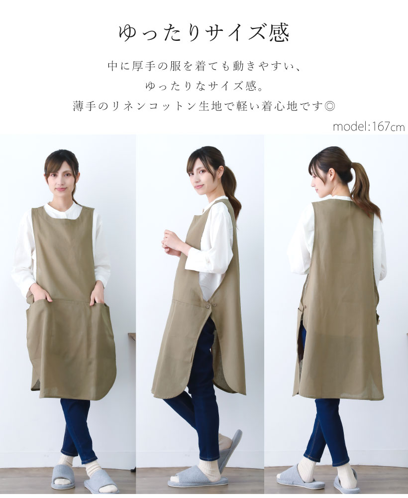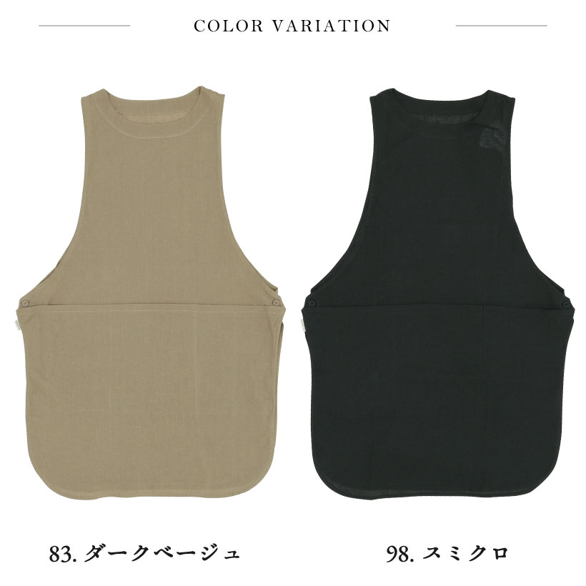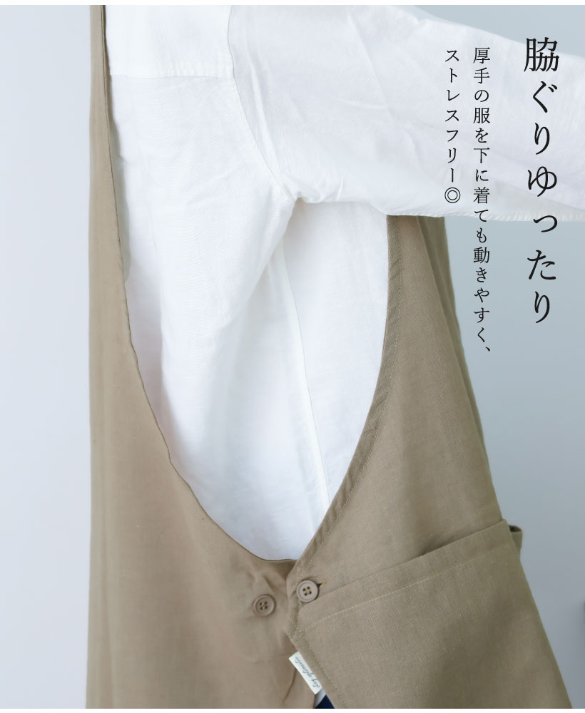 | 薄手のリネンコットン生地で軽い着心地のノースリーブエプロン。ゆったりとしたサイズ感なので、中に厚手の服を着てもストレスなく快適な着心地。 フロント部分には大きめの3連ポケットが付いており、機能性も抜群です。 | |
