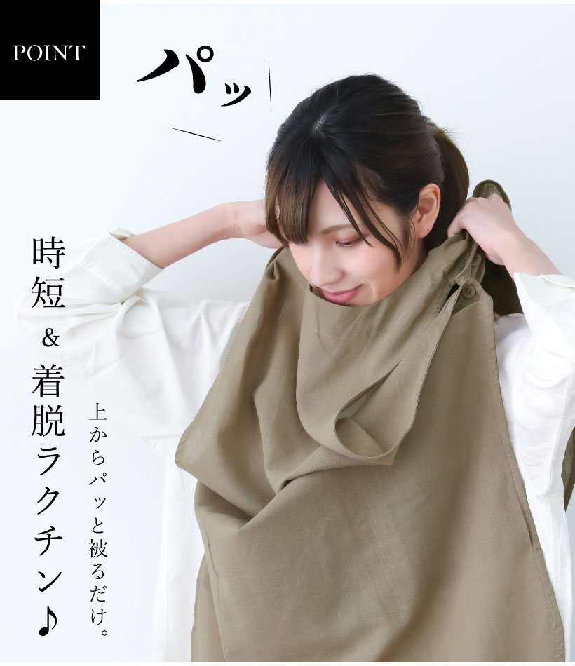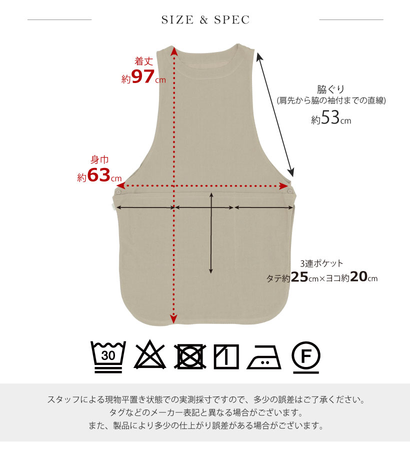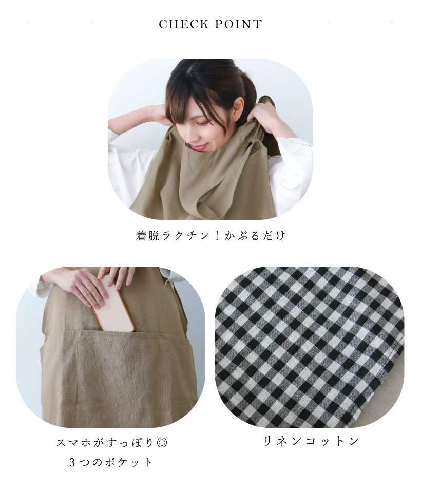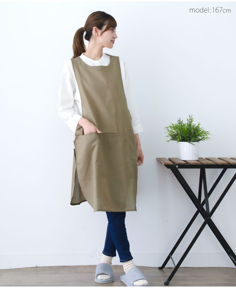 | 薄手のリネンコットン生地で軽い着心地のノースリーブエプロン。ゆったりとしたサイズ感なので、中に厚手の服を着てもストレスなく快適な着心地。 フロント部分には大きめの3連ポケットが付いており、機能性も抜群です。 | |