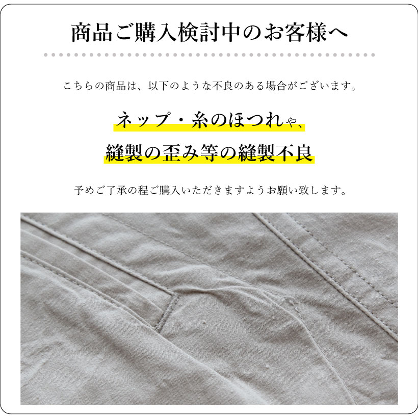 | ●写真の関係で実際の商品と色合いが異なることがございます。 ●風合いを生かした素材の特性上、洗濯により9~10%縮みが生じますのでご注意下さい。水濡れや摩擦等による多少の色落ちは避けられません。濡れたまま放置しますと移染する恐れがありますのでご注意下さい。 ●二次加工(プリント)が施されているものは、プリント部分が色落ちする可能性がございます。必要以上に擦らないで下さい。 ●洗濯の際は洗濯ネットを使用して下さい。 ●洗濯の際は他のものと分けて単品でお洗い下さい。 ●アイロンをかける際は必ず当て布を使用して下さい。 ●手作りのため多少の寸法誤差はご了承下さい。 ●一度洗濯して頂いてからのご使用をお願いします。 |