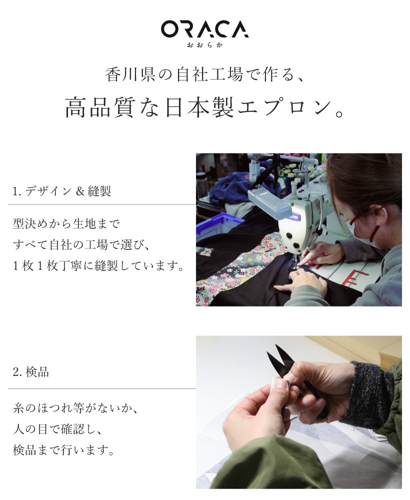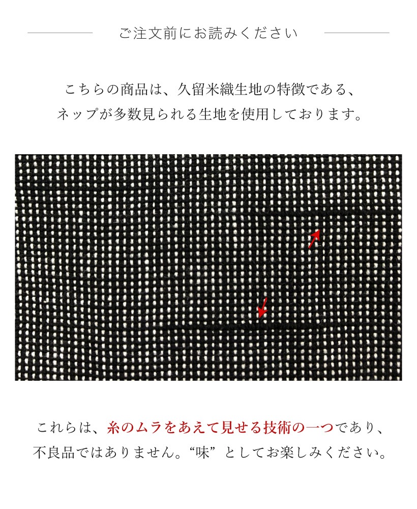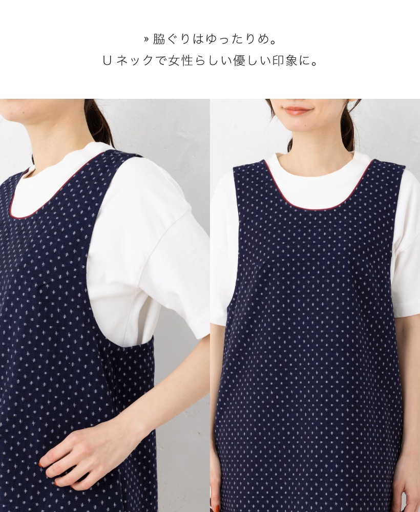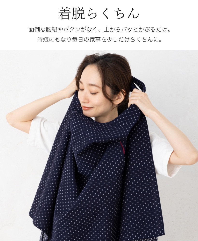 | 筑後地方で代表的な織物である久留米織生地を使用し、日常的に使いやすいようパッと上からかぶって着るだけ!のらくちんエプロンに仕上げました。脇ぐりが広く、締め付け感がないので動きやすく、親しみやすい和調のデザインはプレゼントにもピッタリ。香川県の工場で1枚1枚丁寧に縫製する、高品質な日本製エプロンです。 | |