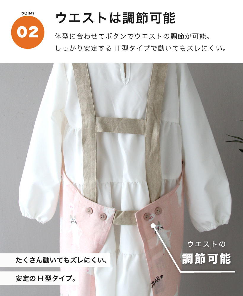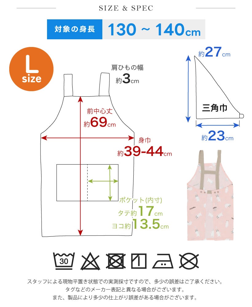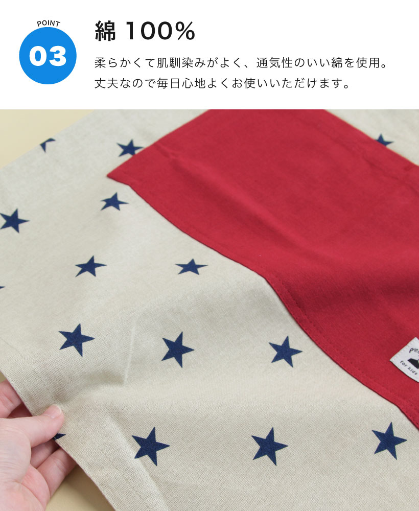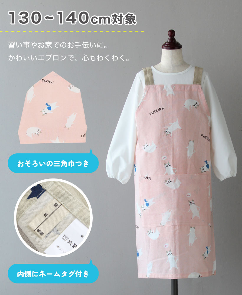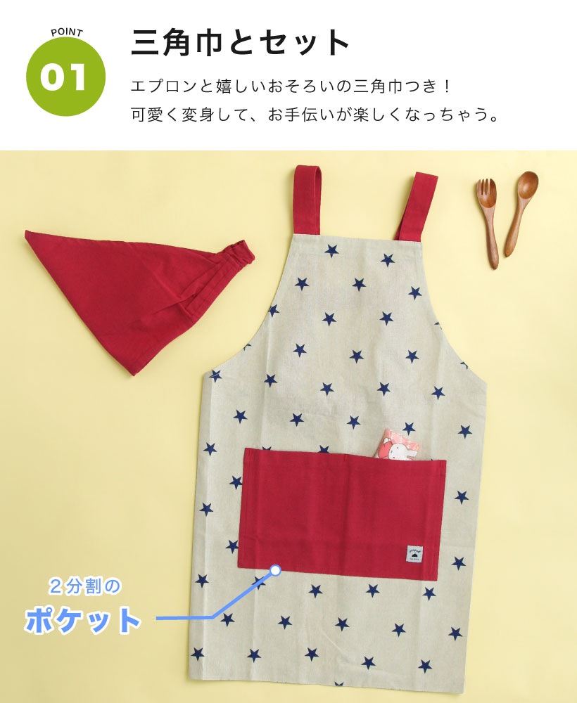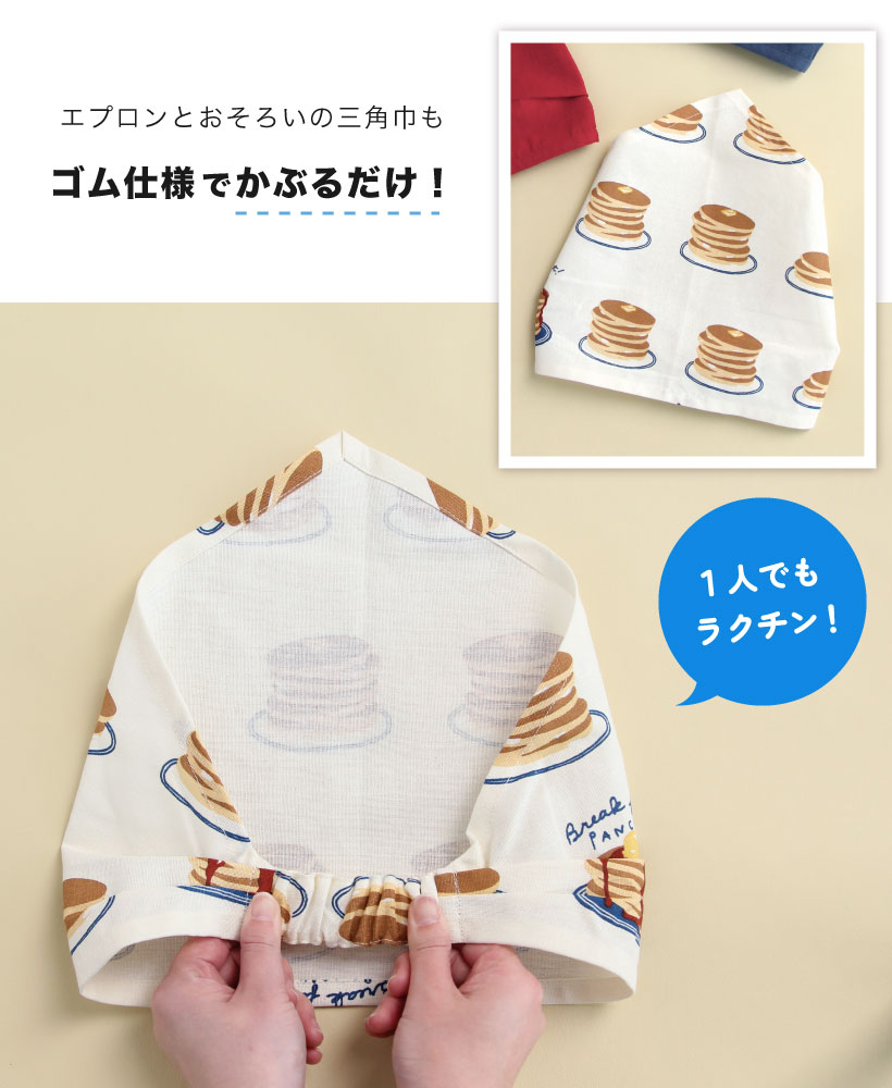 | おうちでのお手伝いに!三角巾とセットになった子供用エプロン。ウエストは、体型に合わせてボタンで調節が可能。三角巾はゴム仕様なので、かぶって着脱ができます。デザインは、男の子も女の子も選べる10種類!。エプロン・三角巾両方に紛失防止のネームタグ付きです。 | |