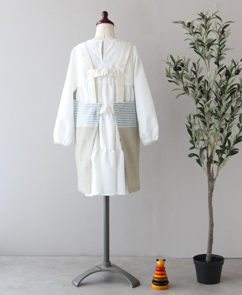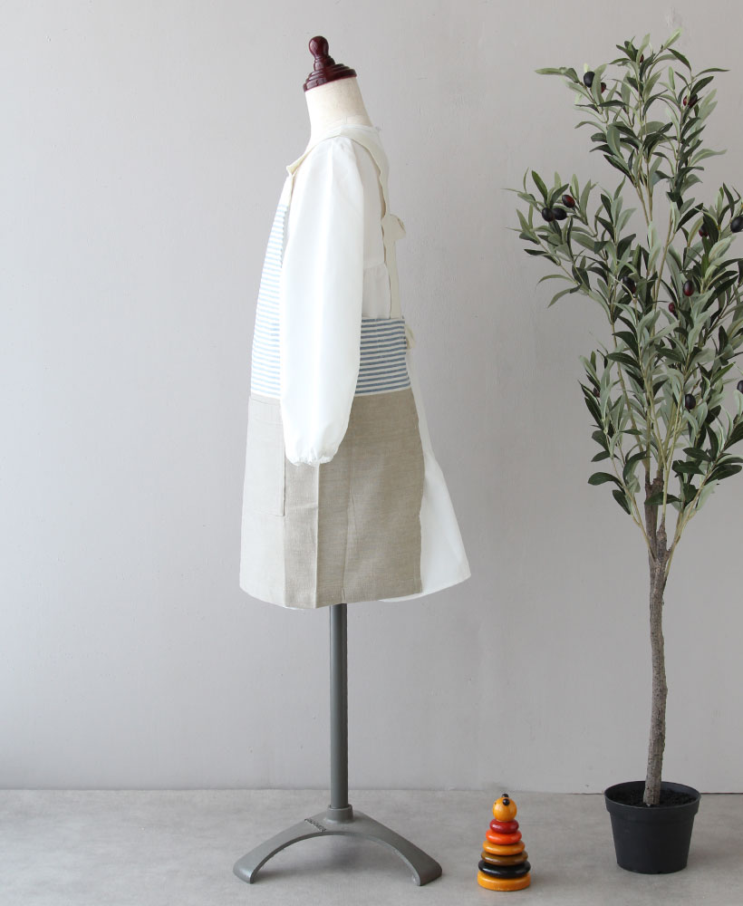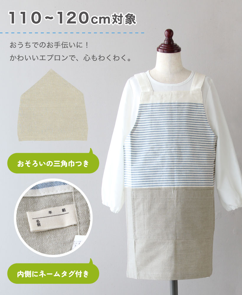 | おうちでのお手伝いに!三角巾とセットになった子供用エプロン。バンザイしてお着替えできる、紐がゴム仕様だから、パパもママもらくちん。デザインは、男の子も女の子も使いやすい、おしゃれなボーダー柄。紛失防止のネームタグがエプロン・三角巾両方についています。 | |