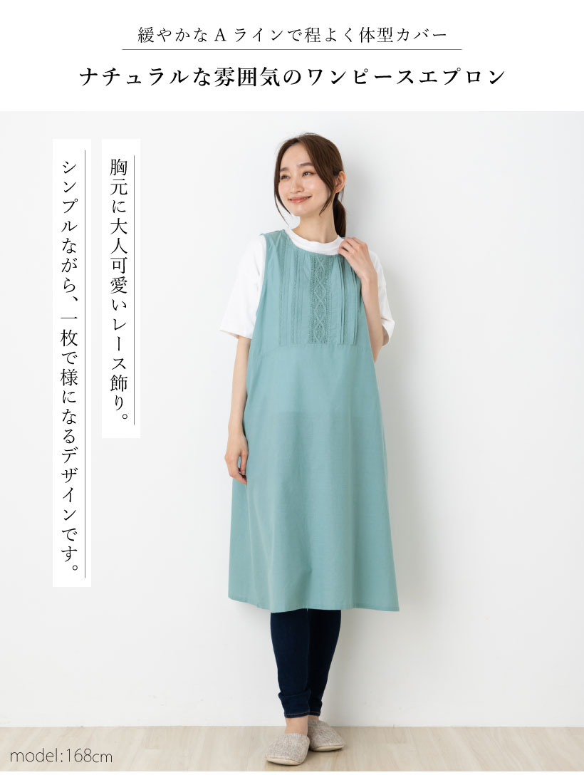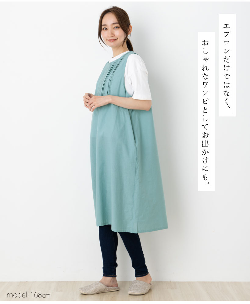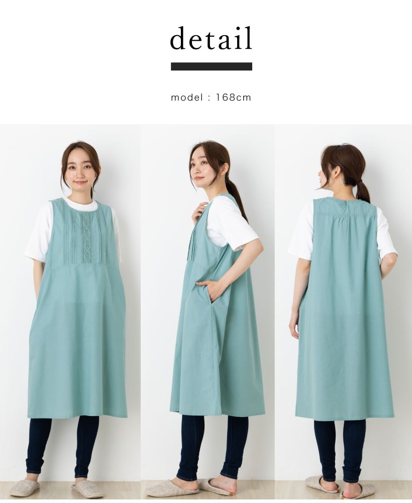 | ナチュラルな雰囲気のワンピースエプロン。柔らかくてさらりとした、やや薄手な生地感。上からかぶるカバータイプで首や肩に負担がかかりにくく、緩やかなAラインシルエットで程よく体型カバーしてくれます。エプロンだけではなく、おしゃれなワンピースとしてお出かけにもお使い頂けます。 | |
