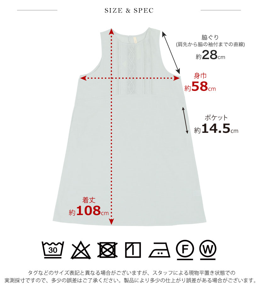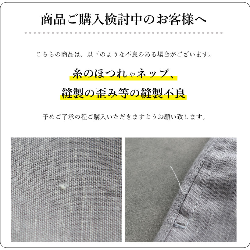 | ●写真の関係で実際の商品と色合いが異なることがございます。 ●素材の特性上、レース部分は引っ掛けが生じ易いので、着用・着脱時、突起物に引っ掛からないようにご注意下さい。 ●素材の特性上、しわになりやすく縮む性質があります。また、自然な風合いを出す為に生地洗いをしております。その為、シワ等がみられ、生地表面のネップ感や織りムラ、風合いなど、1枚1枚微妙に違いますがこれはこの生地の特徴です。あらかじめご了承下さい。 ●着用中の摩擦により、色が落ちる場合があります。淡色バッグ・ベルト等の使用や、淡色衣類との組み合わせ・重ね着などはお避け下さい。また、汗や雨で濡れた時、他の衣類を汚すことがありますのでご注意下さい。 ●洗濯により、多少の縮みがありますので、あらかじめご了承下さい。 ●洗濯の際、色落ちをする場合がありますので、他のものと一緒に洗わず、単独で洗って下さい。また、ネットを使用して下さい。 ●蛍光増白剤配合洗剤・漂白剤(塩素系、酸素系、還元系)は、使用しないで下さい。変色する恐れがあります。 ●脱水しわが残ることがありますので、遠心脱水は短めにして下さい。 ●タンブラー乾燥機は使用しないで下さい。 ●洗濯により、収縮やねじれ、型くずれすることがあります。形を整えて、すぐに干して下さい。 ●長時間、光に当たると変色する恐れがありますので、ご了承下さい。 ●着用の際、縫い目に過度の力が加わると、縫い目が開いてしまうことがあります。ご注意下さい。 |
