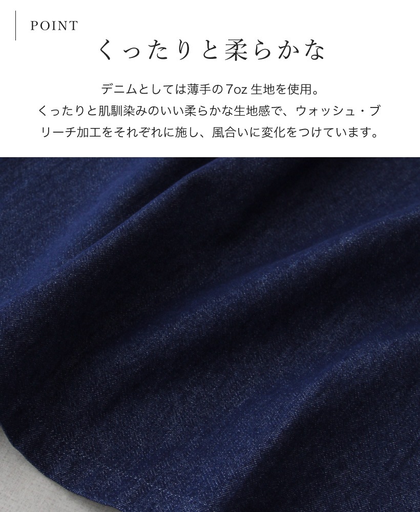 | デニム 紺 ネイビー ウォッシュ ブリーチ ブルー やわらか 7oz やや薄手 カジュアル きれいめカジュアル ひざ下丈 ポケット ペン差し シンプル 無地 お尻隠れる 女性 レディース 大人 | |