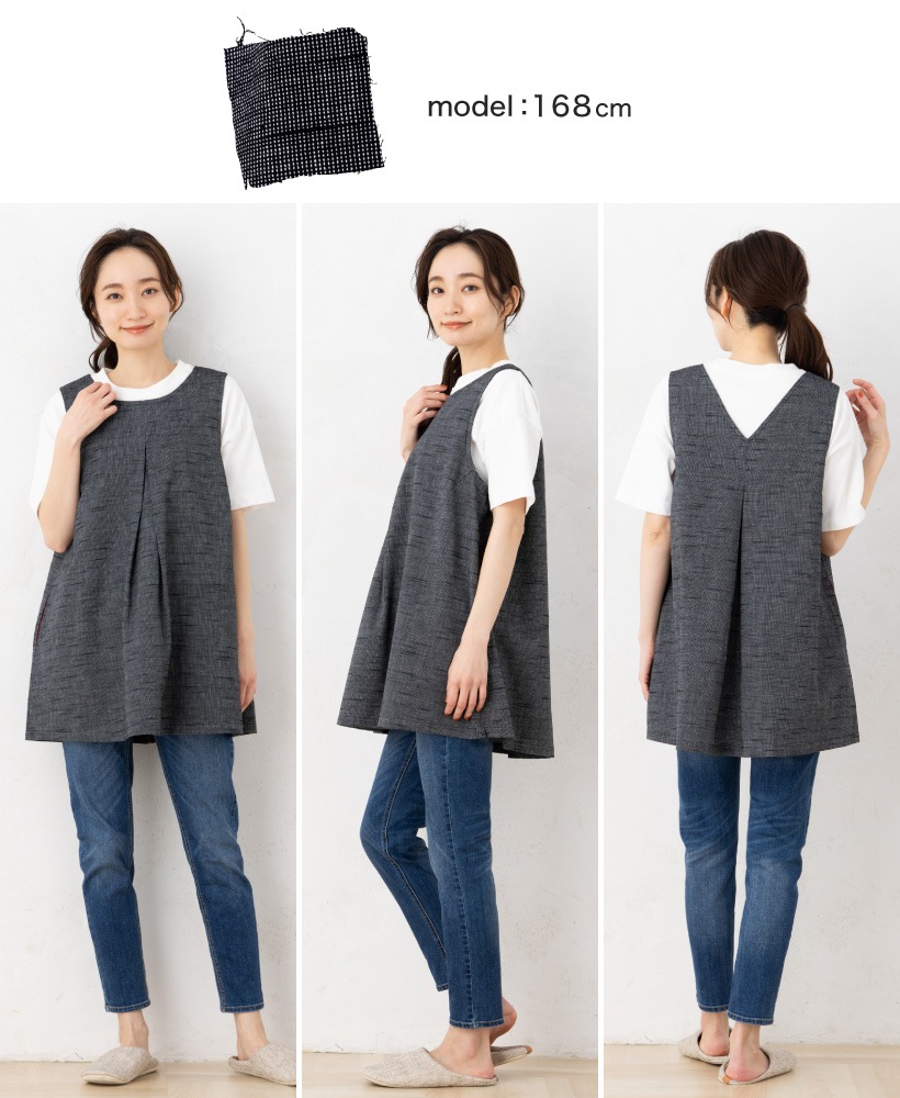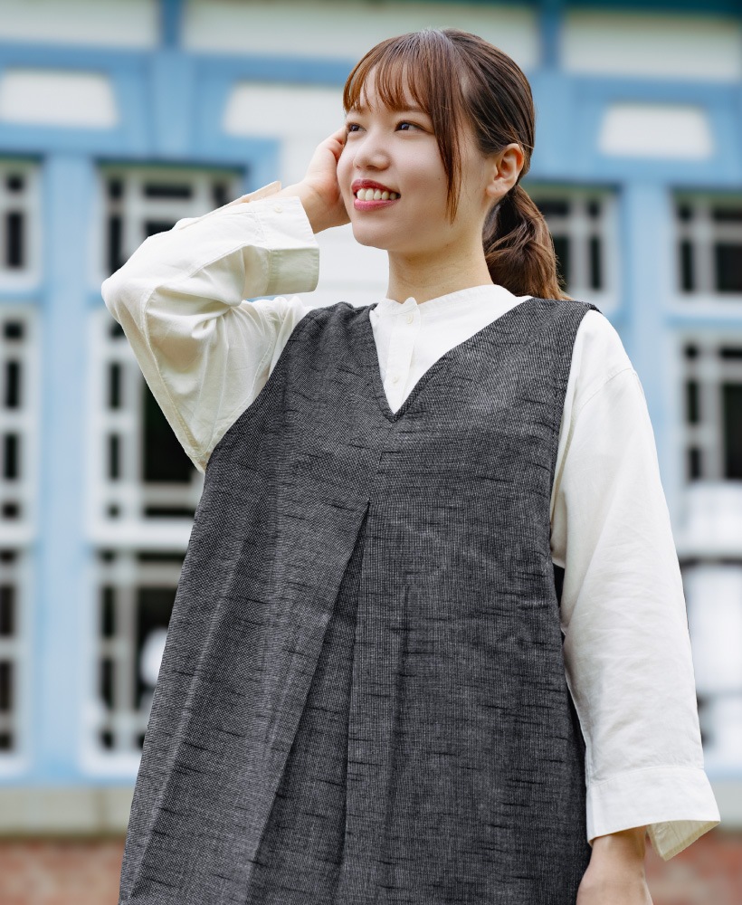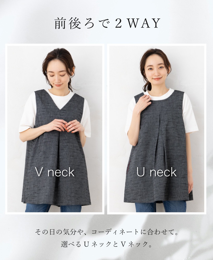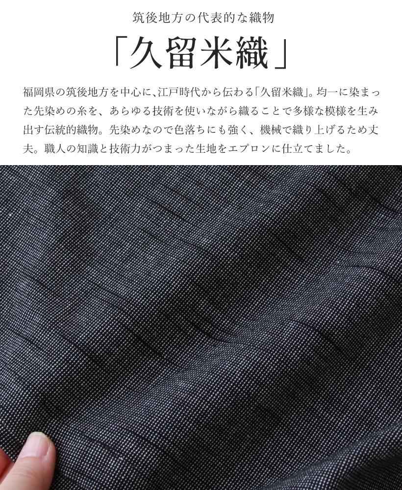 | 筑後地方で代表的な織物である久留米織生地を使用し、前後ろでUネックとVネックの両方楽しめる2WAY仕様。膝上の短めの丈感なので動きやすく、低身長の方にもぴったり。和調で馴染みやすいデザインは、幅広い年代の方に着用いただけます。香川県の工場で1枚1枚丁寧に縫製する、高品質な日本製エプロンはプレゼント・ギフトにも最適です。 | |