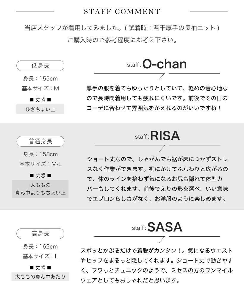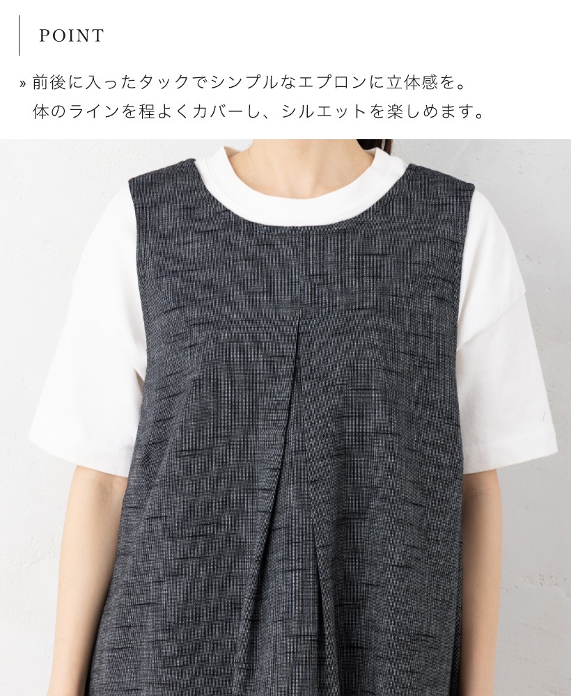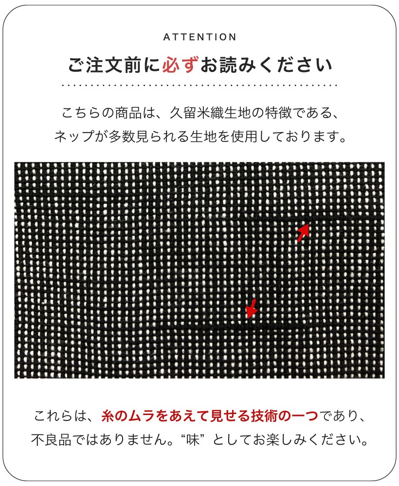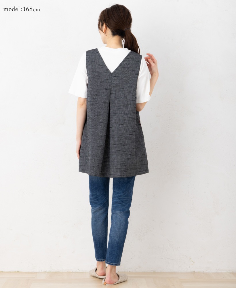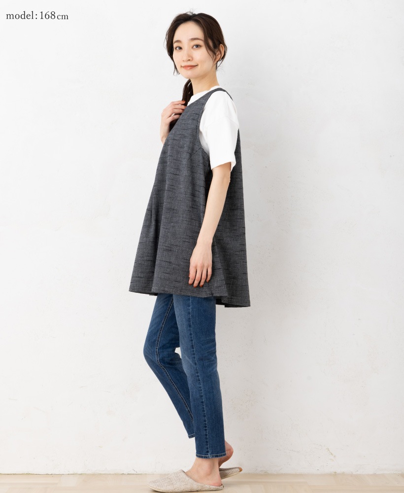 | 筑後地方で代表的な織物である久留米織生地を使用し、前後ろでUネックとVネックの両方楽しめる2WAY仕様。膝上の短めの丈感なので動きやすく、低身長の方にもぴったり。和調で馴染みやすいデザインは、幅広い年代の方に着用いただけます。香川県の工場で1枚1枚丁寧に縫製する、高品質な日本製エプロンはプレゼント・ギフトにも最適です。 | |
