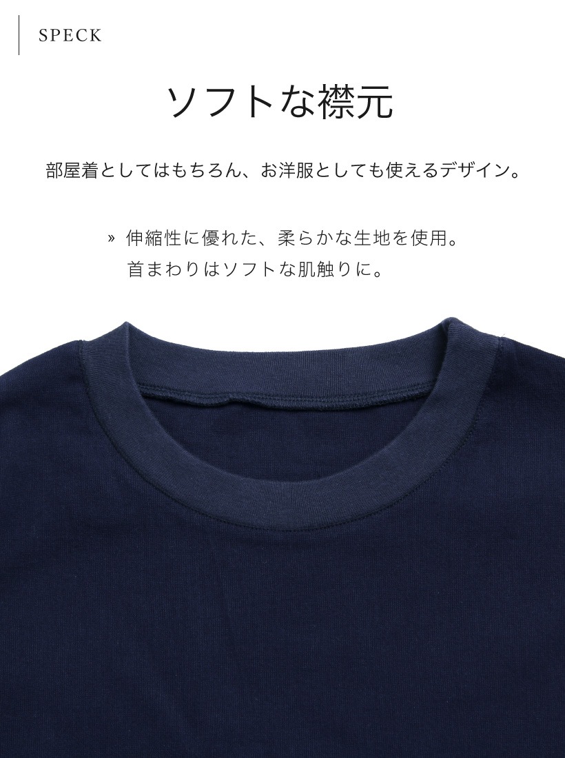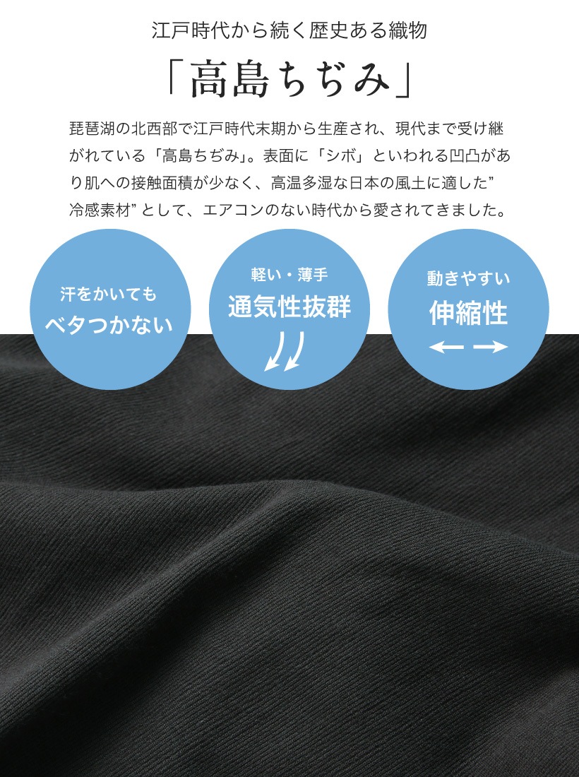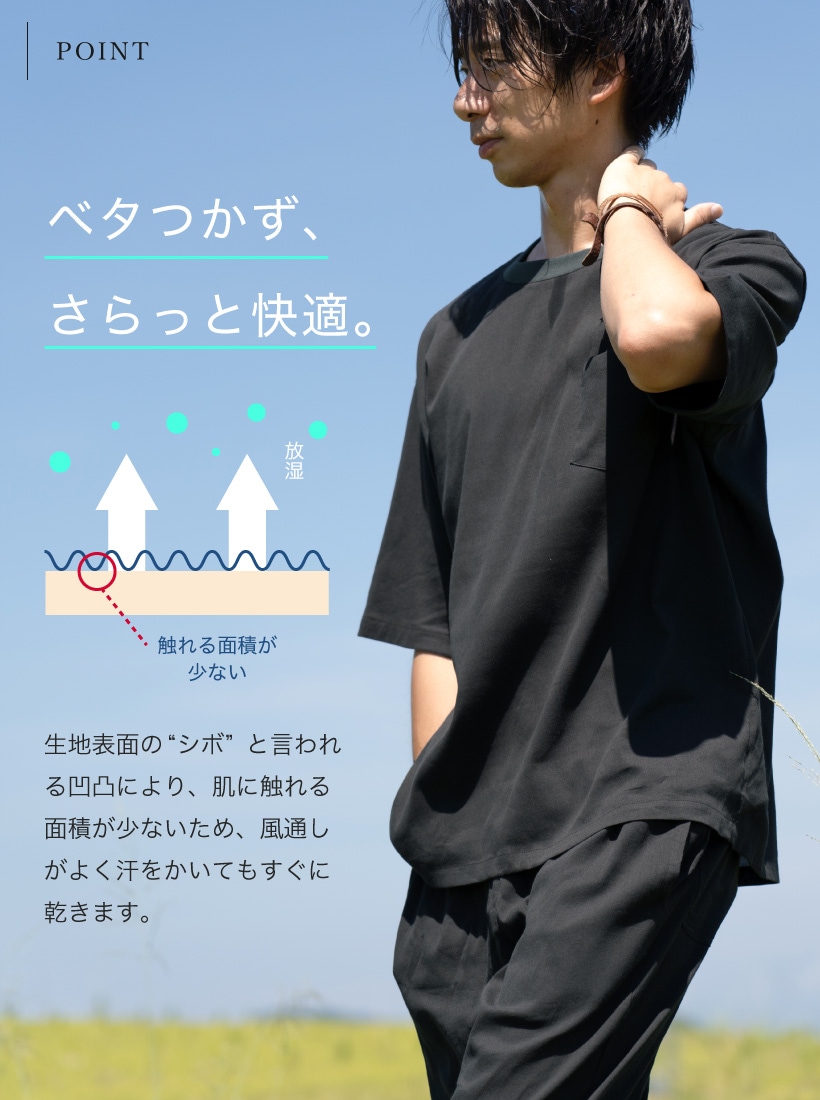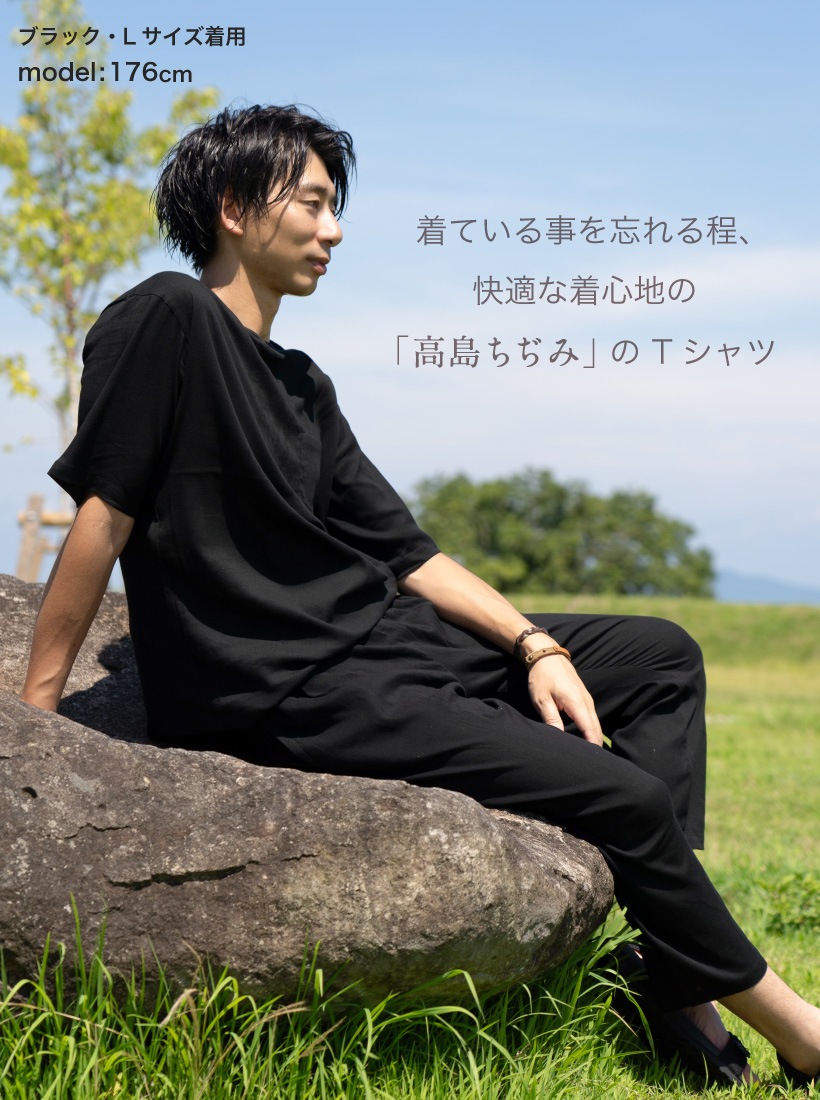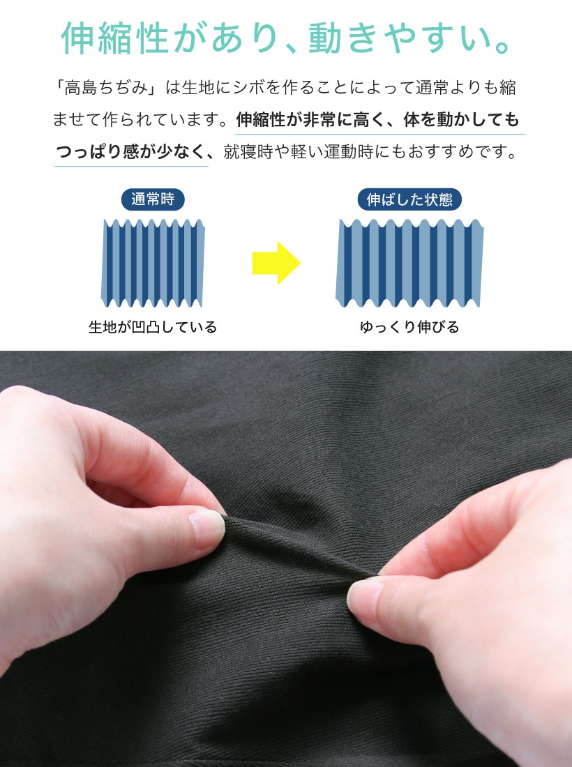 | 高島ちぢみを使ったルームウェアTシャツ。シンプルな無地で、お洋服としても着用できるようなデザインにしあげました。高島ちぢみ特有のシボによって、肌への接着面が少ないため風通しが良く、さらっと快適。蒸し暑い夏の暑さを快適に過ごせます。 | |