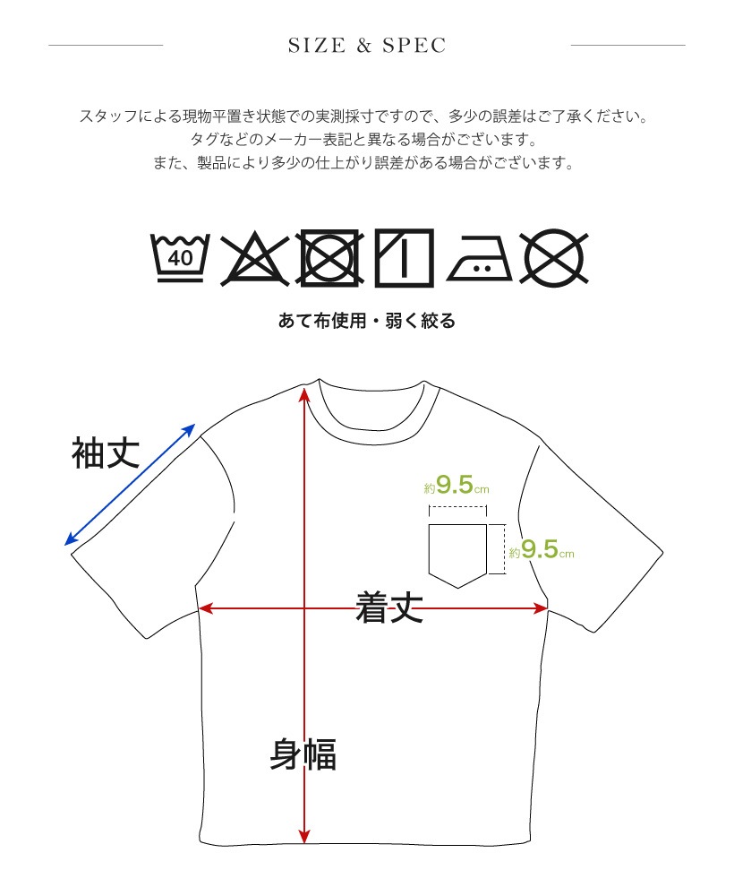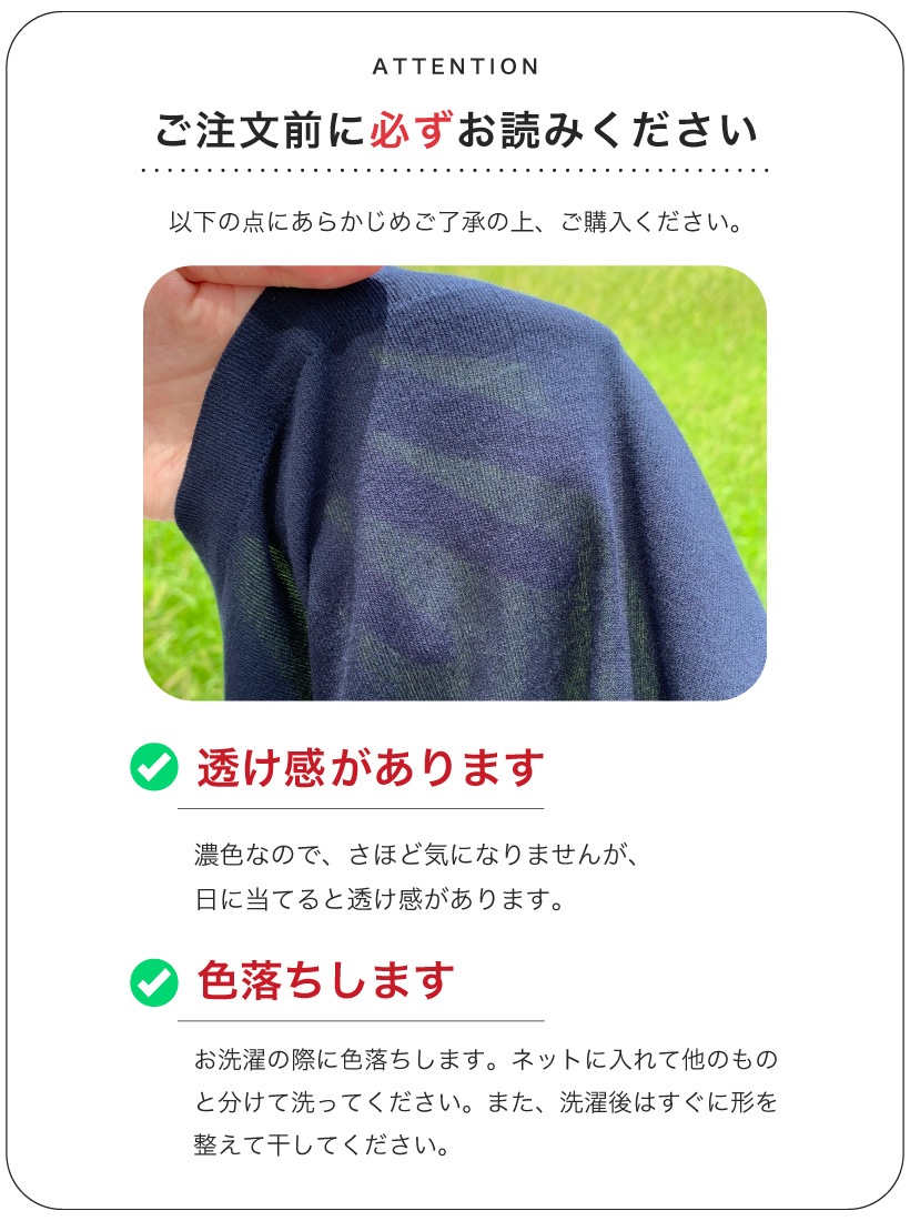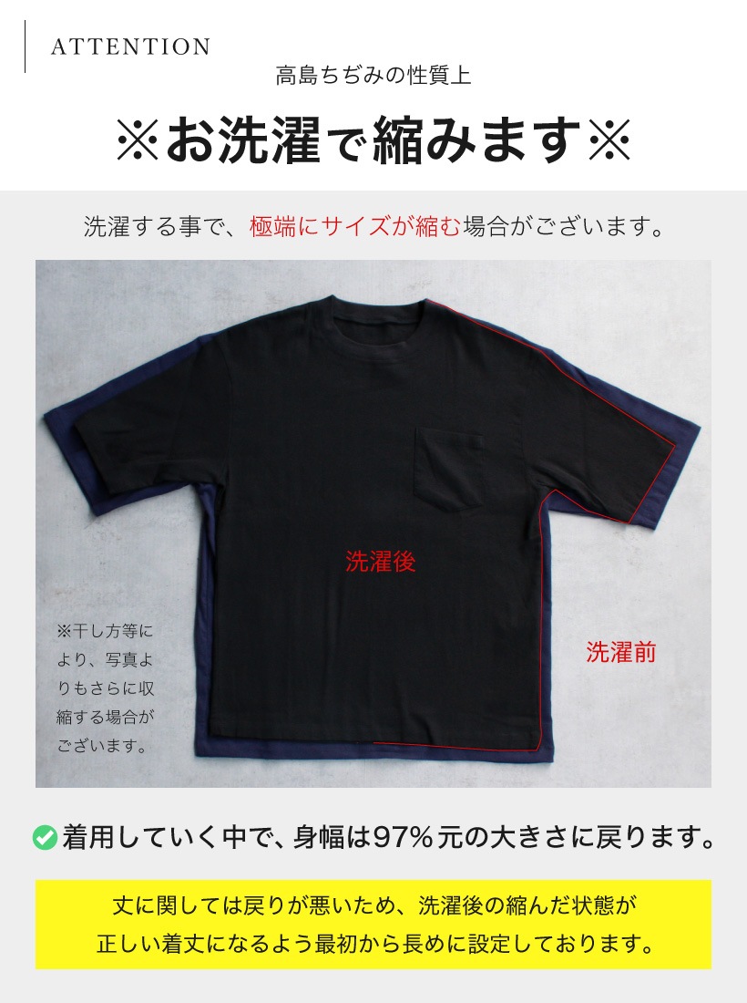 | 【洗濯の際のご注意】 ●洗濯後、素材の性質上、極端にサイズが縮む可能性があります。形を整えて縫製部分に無理を加えないように干してください。 ●伸縮したあとでも、着用していく中で身幅は97%元の大きさに戻っていきます。 ●移染の恐れがありますので洗濯後直ちに干してください。 ●洗濯中、色落ちすることがありますので、白または淡色物とは別にして洗ってください。 ●色移りの恐れがございますので手洗い及び浸け置き洗いはお避けください。 ●写真の関係で実際の商品と色合いが異なることがございます。 ●汗や水で湿った状態で放置したり摩擦すると、色移りすることがありますのでご注意ください。 ●洗濯の際は漂白剤を使用しないでください。 ●生成りやパステルカラー等の淡色製品には蛍光増白剤が入っていない洗剤を使用して下さい。色が変わることがあります。 ●濃色製品は色落ちする恐れがありますので、洗濯の際は、ネットに入れて他のものと分けて洗ってください。 ●長時間濡れたままにしておきますと色がうつる心配がありますのでご注意ください。 ●洗濯後は、ゆるく絞り、すぐに形を整えて日陰に干してください。 ●タンブル乾燥はしないでください。 |