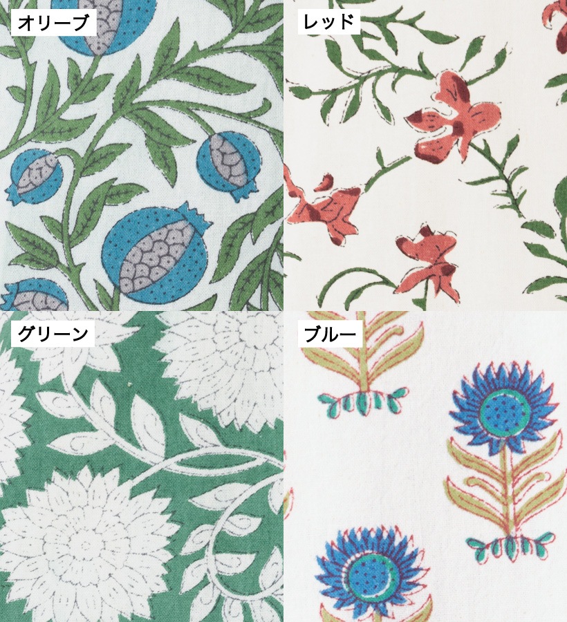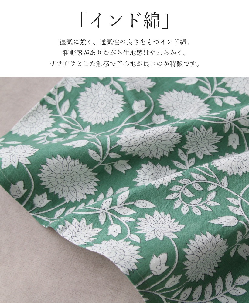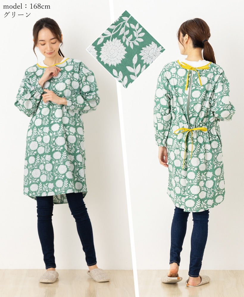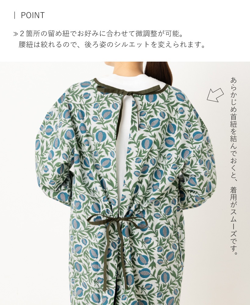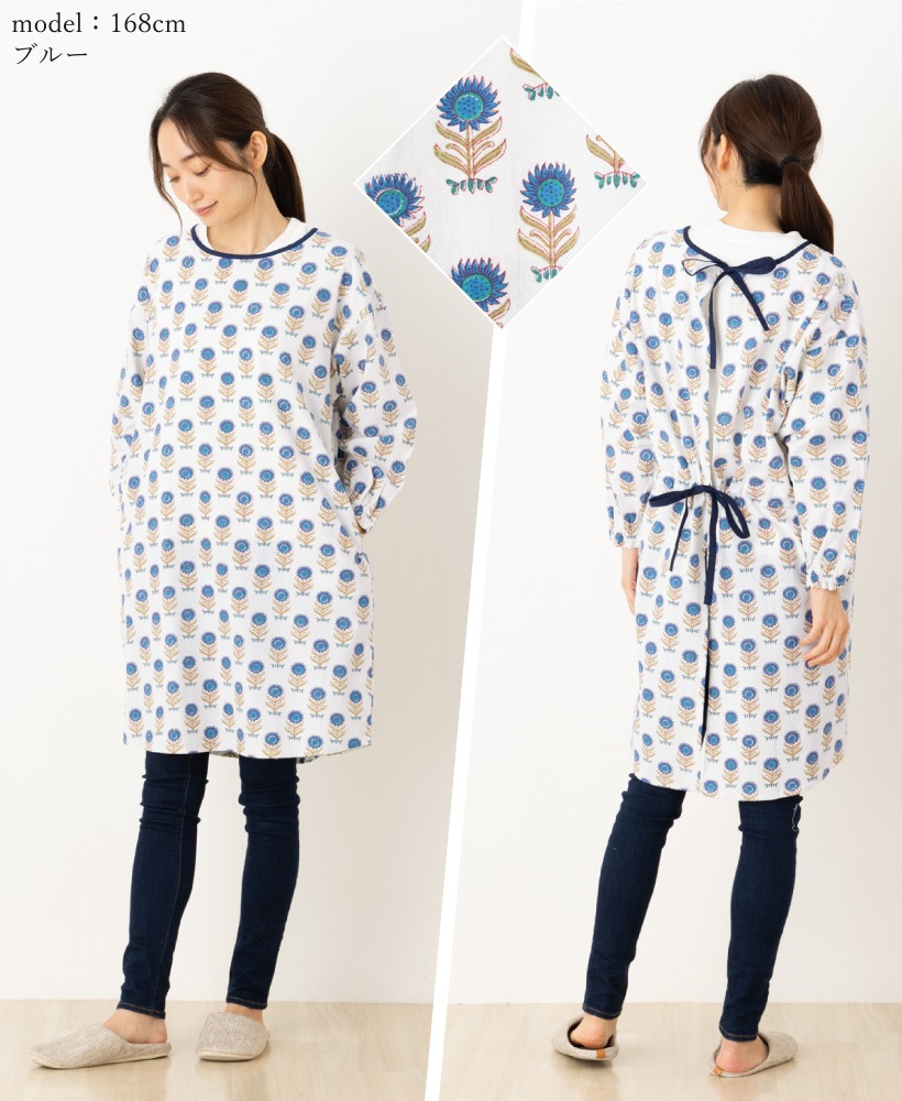 | 湿気に強く着心地のよいインド綿を使用した割烹着。首紐と肩紐が調節できるので、中に着る服を選ばずに着用していただけます。袖口はシャーリングになっていて水仕事の時も安心。ほんのりエスニックな花柄を色鮮やかにまとめました。 | |