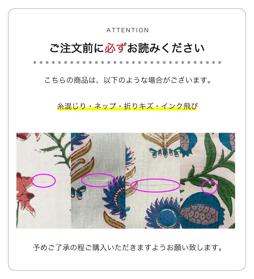 | ●写真の関係で実際の商品と色合いが異なることがございます。 ●火気に近づけますと、繊維が溶けたり、燃えたりする恐れがあります。やけどの心配がありますので充分にご注意をお願いします。 ●洗濯の際は、漂白剤を使用しないでください。 ●生成りやパステルカラー等の淡色製品には蛍光増白剤が入っていない洗剤を使用してください。色が変わることがあります。 ●風合いを生かした素材の特性上、洗濯により9~10%縮みが生じますのでご注意下さい。水濡れや摩擦等による多少の色落ちは避けられません。濡れたまま放置しますと移染する恐れがありますのでご注意下さい。 ●縫製部分へ過度な力が加われば、縫い目が開く可能性があります。 ●二次加工品(プリント)ですので、必要以上に擦らないで下さい。プリント部分が色落ちする可能性がございます。 ●洗濯の際は洗濯ネットを使用して下さい。 ●濃色製品は色落ちする恐れがありますので、洗濯の際は他のものと分けて単品でお洗い下さい。 ●タンブル乾燥はしないでください。 ●アイロンをかける際は必ず当て布を使用して下さい。 ●手作りのため多少の寸法誤差はご了承下さい。 ●一度洗濯して頂いてからのご使用をお願いします。 |