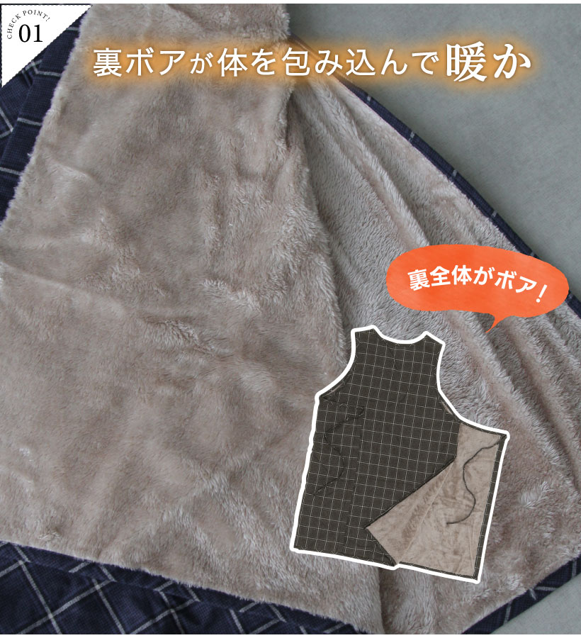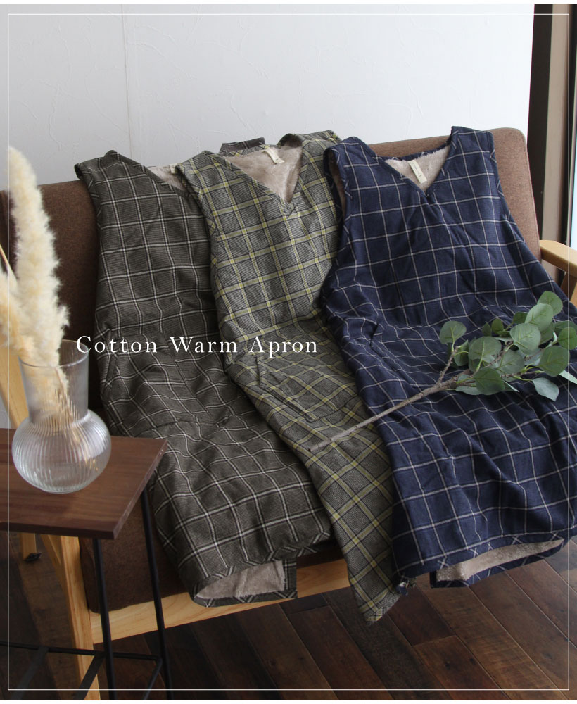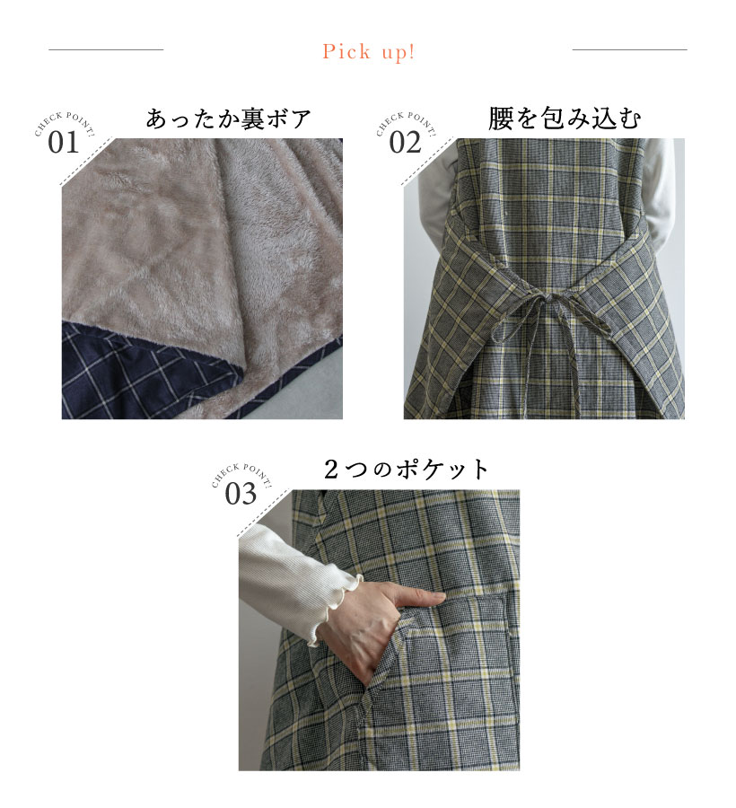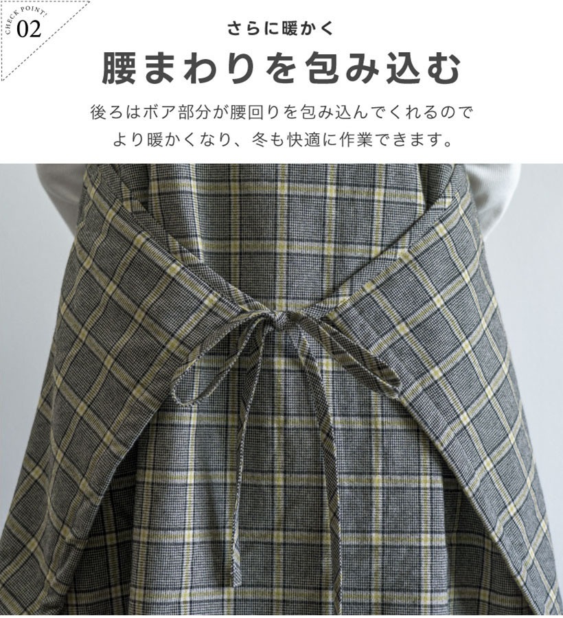 | 人気のタブリエ風エプロンを裏ボア付きアレンジ。 後ろは重なり部分が腰あたりをさらに包み込む仕様なのでより暖かい◎冷え性のかたにもおすすめです! 冬らしいグレンチェック柄もポイント。冬場の家事や、家の中でも快適に過ごせます。 | |