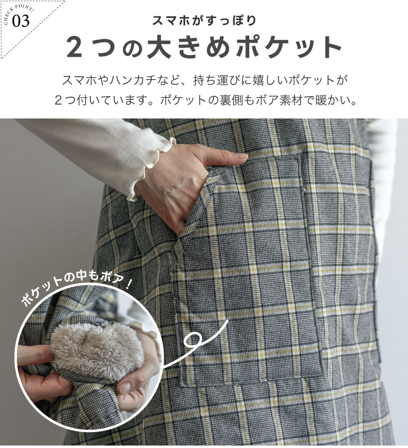 | 裏ボア あったか 暖かエプロン チェック ポケット ゆったり カバー 上からかぶる レディース コットン 秋 冬 M L ノンノ ナチュラル おしゃれ かわいい カジュアル nap1535 ネイビー アイボリー ブラック | |