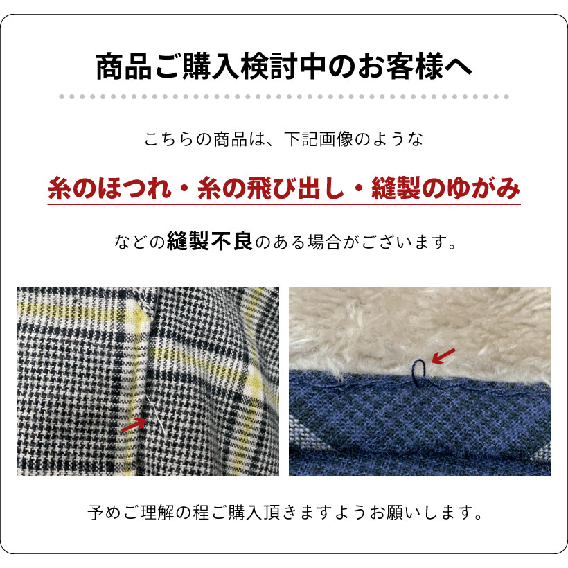 | ●写真の関係で実際の商品と色合いが異なることがございます。 ●毛羽が燃えやすいので、火に近づけないで下さい。 ●自然な風合いを出す為に生地洗いをしています。その為、しわ等がみられ、生地表面のネップ感や織りムラ、風合いなど、1枚1枚微妙に違いますがこれはこの生地の特徴です。あらかじめご了承下さい。 ●素材の特性上、表面を起毛にしている為、他の衣服に毛羽が付いたり、毛足が倒れ変色したように見える場合があります。 ●裏地部分は素材の特性上、引っ掛けが生じ易いので、着用・着脱時、突起物に引っ掛からないようにご注意下さい。 ●着用中の摩擦や洗濯により、ピリング(毛玉)が生じる事があります。ビリングが発生しましたら、引っ張らずにブラッシングするか、小バサミ等で丁寧に取り除いて下さい。 ●洗濯により、多少の縮みがありますので、あらかじめご了承下さい。 ●洗濯の際、色落ちをする場合がありますので他のものと一緒に洗わず、単独で洗って下さい。また、ネットを使用して下さい。 ●蛍光増白剤配合洗剤・漂白剤(塩素系、酸素系、還元系)は、使用しないで下さい。変色する恐れがあります。 ●脱水しわが残ることがありますので、遠心脱水は短めにして下さい。 ●家庭洗濯時、タンブラー乾燥機は使用しないで下さい。 ●洗濯により、収縮やねじれ、型くずれすることがあります。形を整えて、すぐに干して下さい。 ●裏地生地へのアイロンはお避け下さい。ただし、表面からあて布をした上でなら、低温でアイロン掛けできます。フリースへ直接かけると、変質・変色の恐れがあります。 ●長時間、光に当たると変色する恐れがありますので、ご了承下さい。 ●着用の際、縫い目に過度の力が加わると、縫い目が開いてしまうことがあります。ご注意下さい。 |