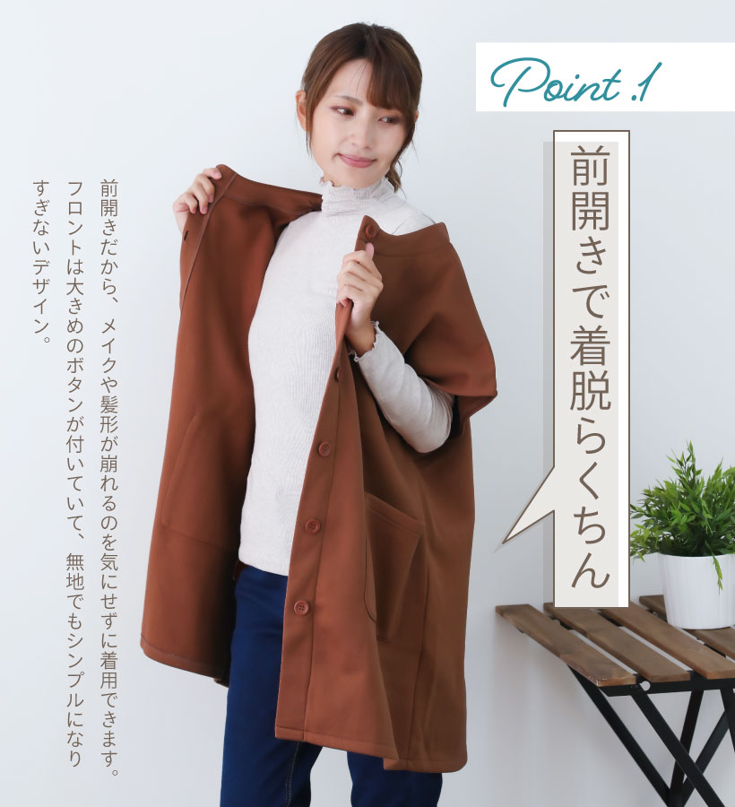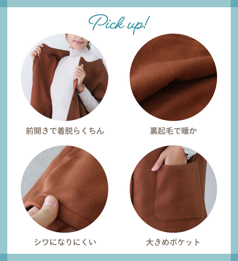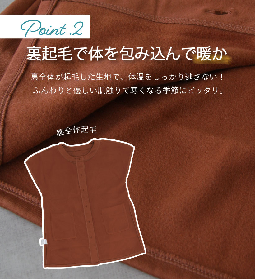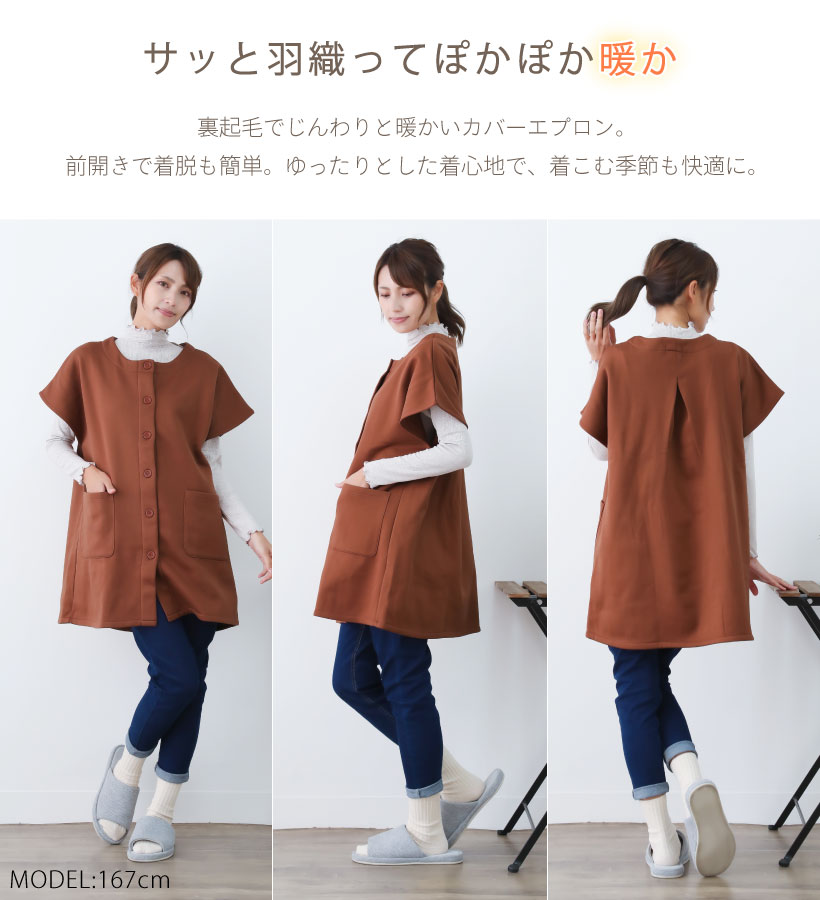 | 洋服のように着られるファッショナブルな半そで割烹着。 ゆったりとした着心地なので、下に着るものを選ばない。 前面が裏起毛で 冷える腰や肩もあったか。割烹着としてはもちろん、防寒対策にも◎ デイリーにお使いいただけるおすすめカッポーギです。 | |
