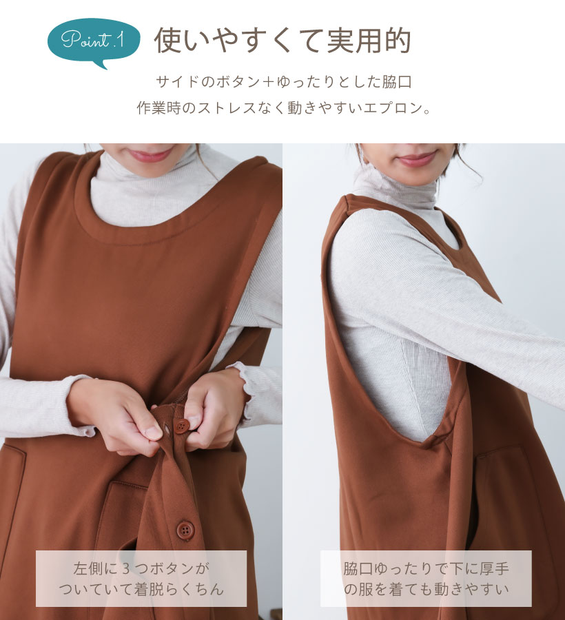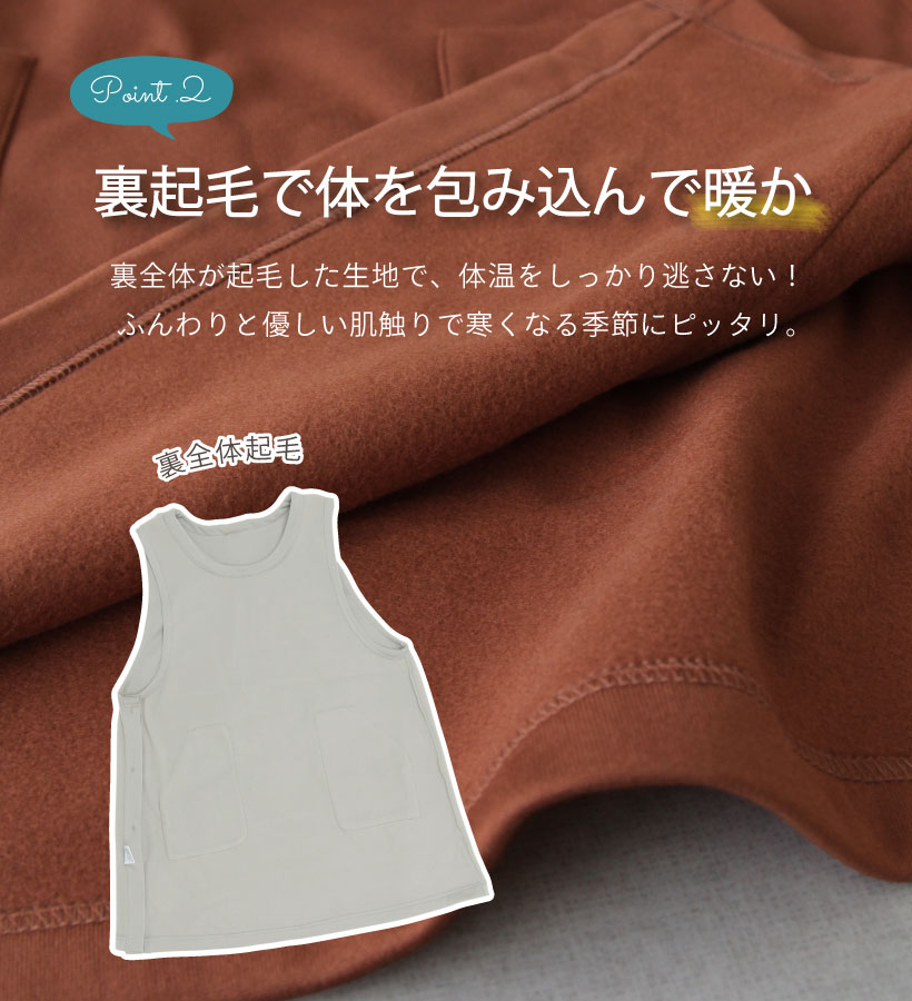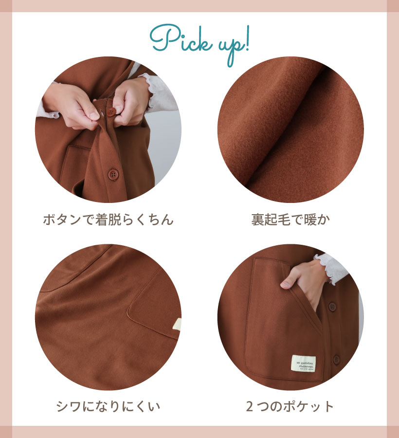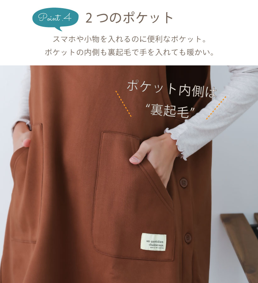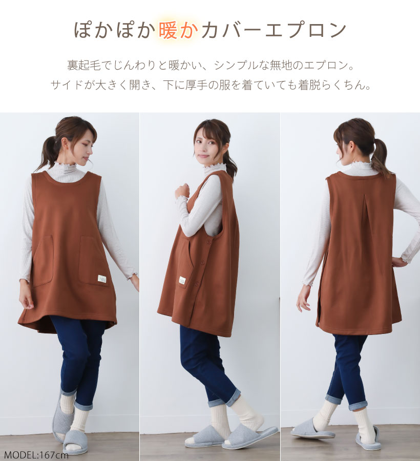 | 肌寒い時期にぴったりな裏起毛仕様のカバーエプロン。 全面が裏起毛で着るだけで防寒出来る優れもの。 左サイドの3つのボタンで着脱もカンタン。 大きめのポケットで機能性も抜群です〇 | |
