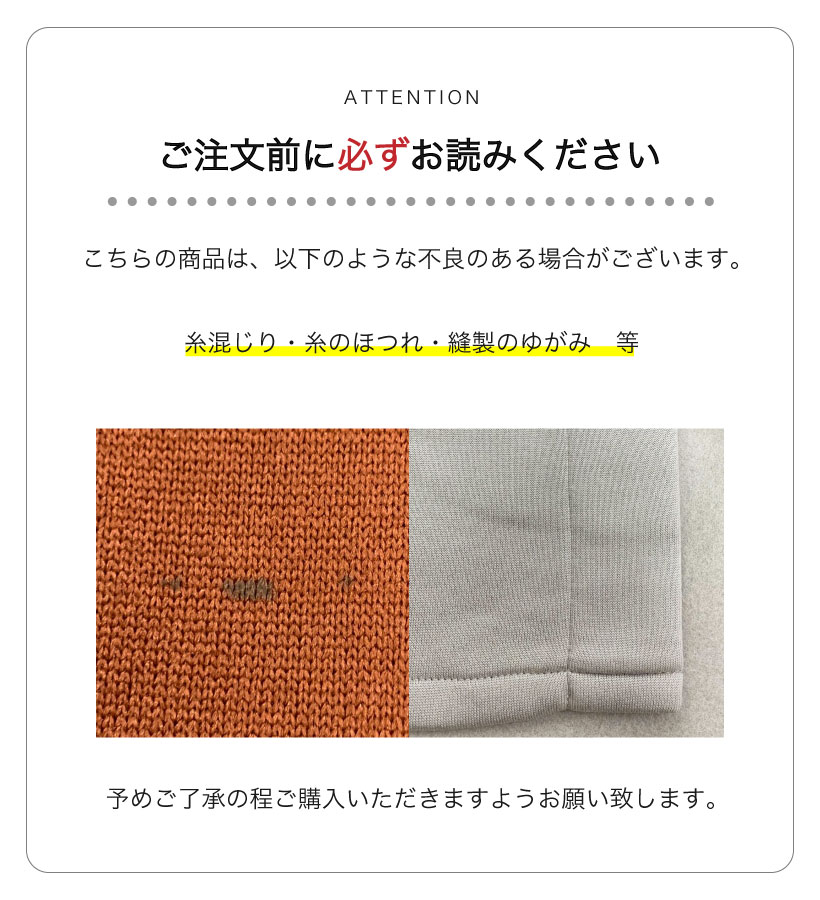 | ●写真の関係で実際の商品と色合いが異なることがございます。 ●水洗いにより多少色落ちする場合がありますので白物と分けてお洗い下さい。一度お洗い頂いてからのご使用をお薦めします。 ●濡れたまま他の物と重ねておくと移染しますので洗濯後は形を整えて早めに干して下さい。 ●汗や雨などで濡れたり、強く擦られたりしたとき、色落ちし、他の物へ移染する事がありますので、白物との組み合わせ、重ね着はお避け下さい。 ●生成り・淡色商品には無蛍光洗剤をご使用下さい。 ●乾燥機のご使用はお避け下さい。 ●アイロンは当て布を使用して下さい。 ●お洗濯により多少縮む場合があります。ご了承下さい。 ●性質上・摩擦により毛羽立ち、毛玉が出来やすい商品です。 |