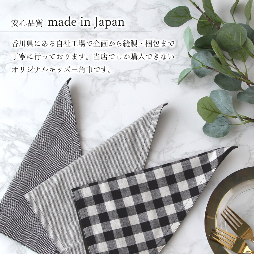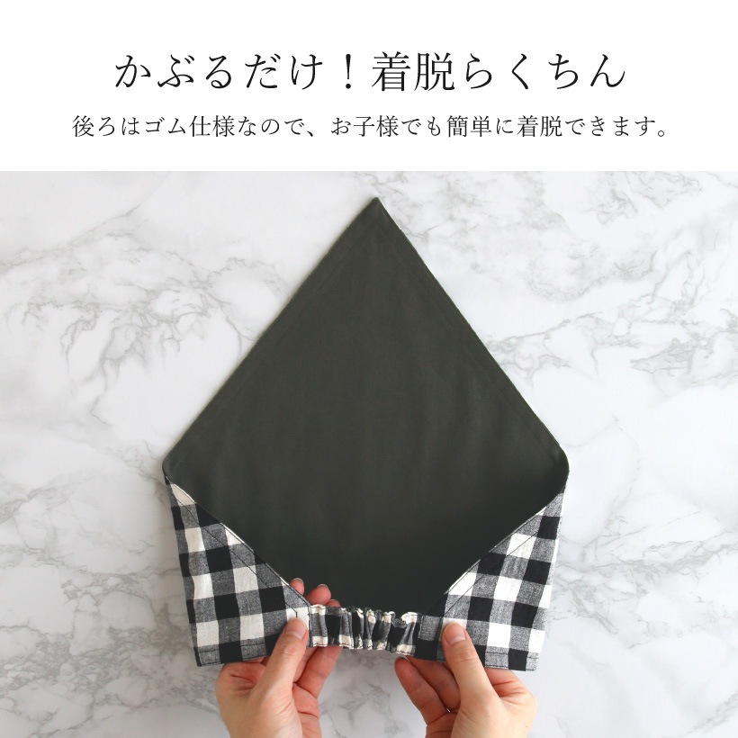 | 安心の日本製!小さなお子様も、1人で脱ぎ着しやすいゴムバンドタイプの日本製三角巾。モノトーンの上品なデザインで、下に着るエプロンとも合わせやすい◎ お家でのお手伝いや、保育園・幼稚園・小学校にも使えて色々なシーンで大活躍!Mサイズ/Lサイズと2つあり、小さいお子様から高学年のお子様まで対応いたします!入園・入学準備にもおすすめの三角巾です。