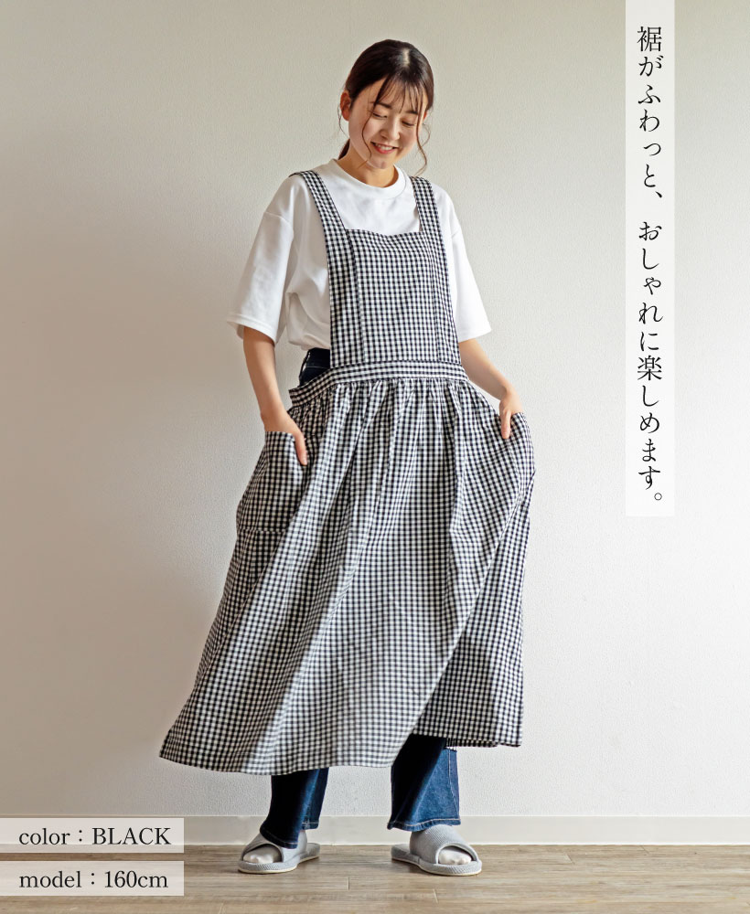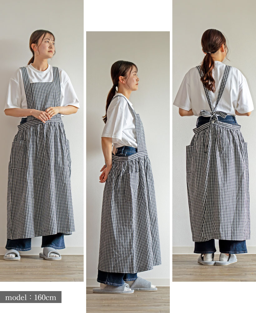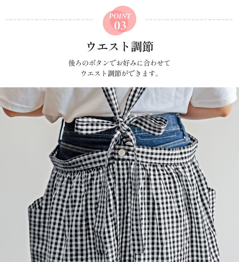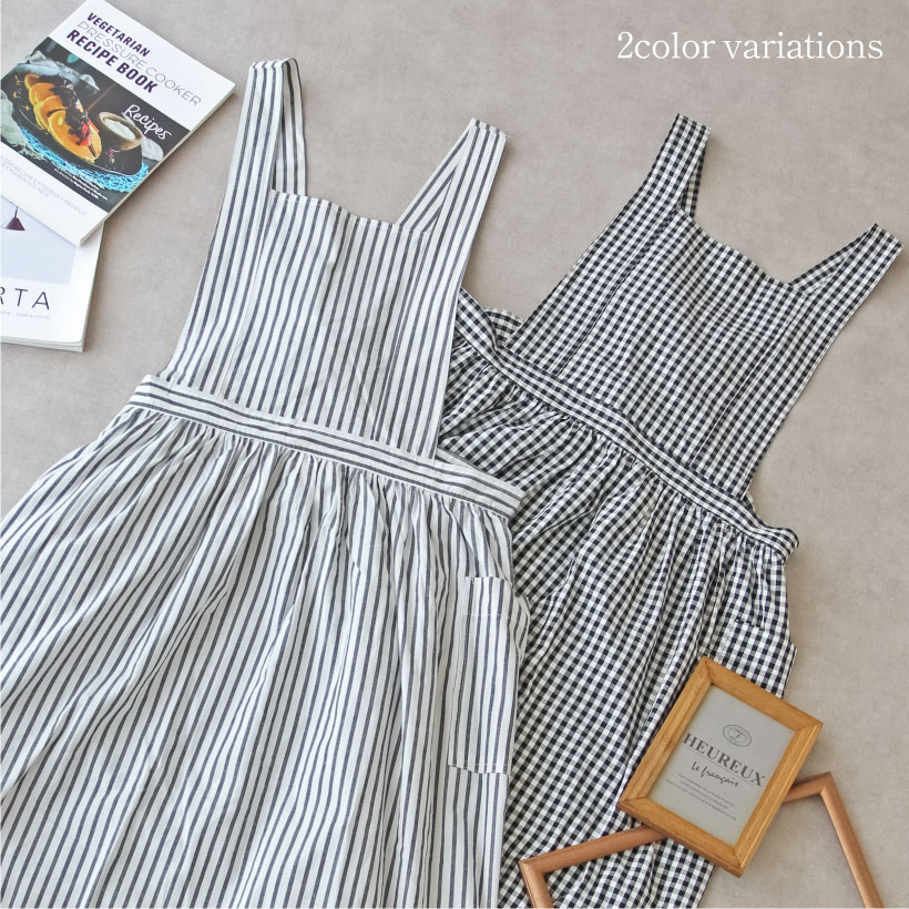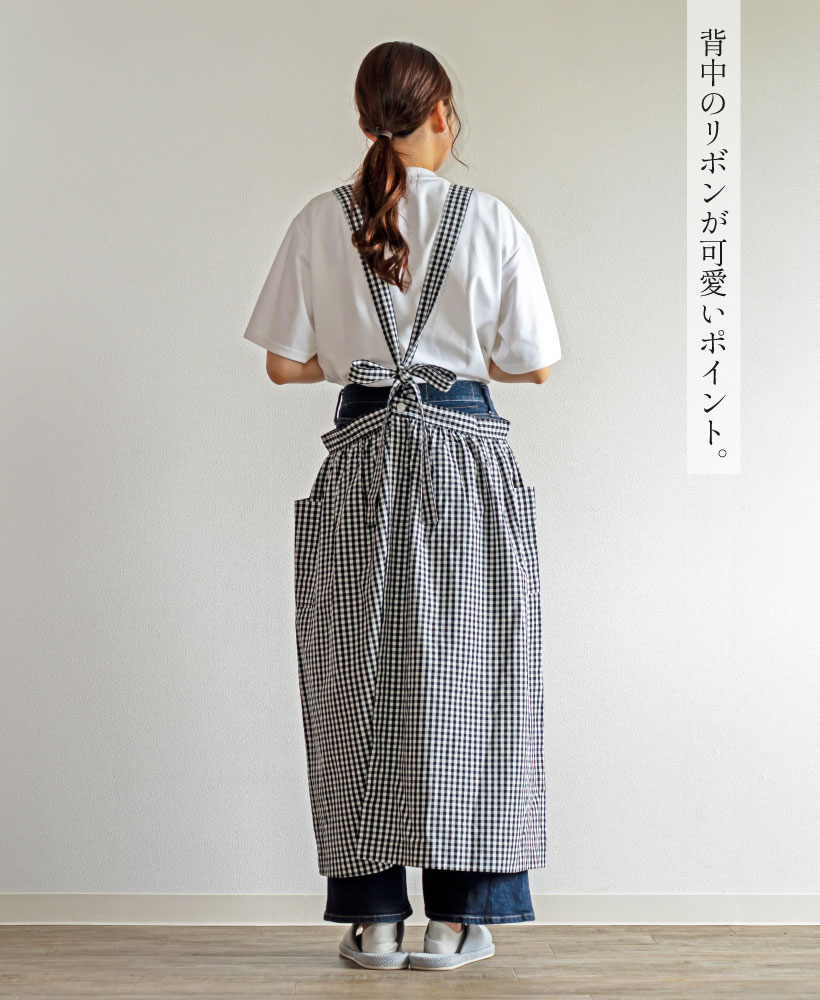 | 裾がふんわりワンピースエプロン。チェック柄とストライプ柄の2種類からお選びいただけます。両サイドのポケットやウエスト調整ボタンなど機能性もばっちり◎背中のリボンやゆったりとした着心地などオシャレを楽しむこともできます♪ | |